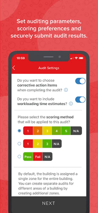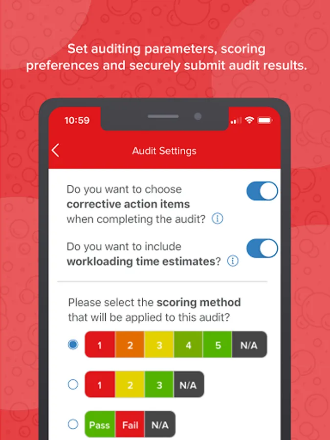 - Set auditing parameters, scoring preferences and securely submit audit results to admin site