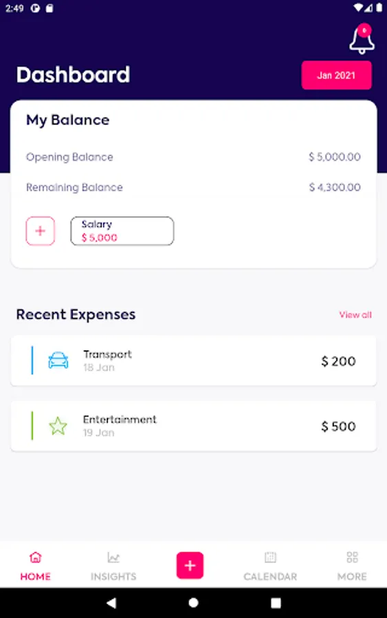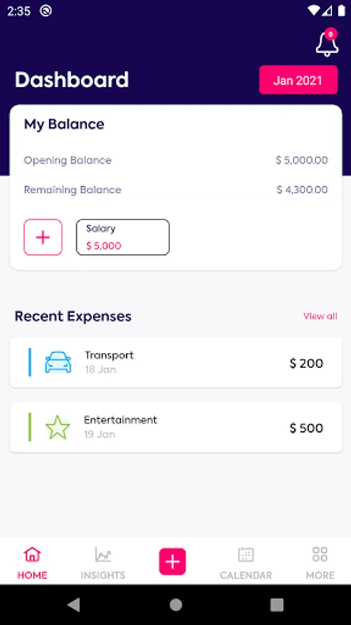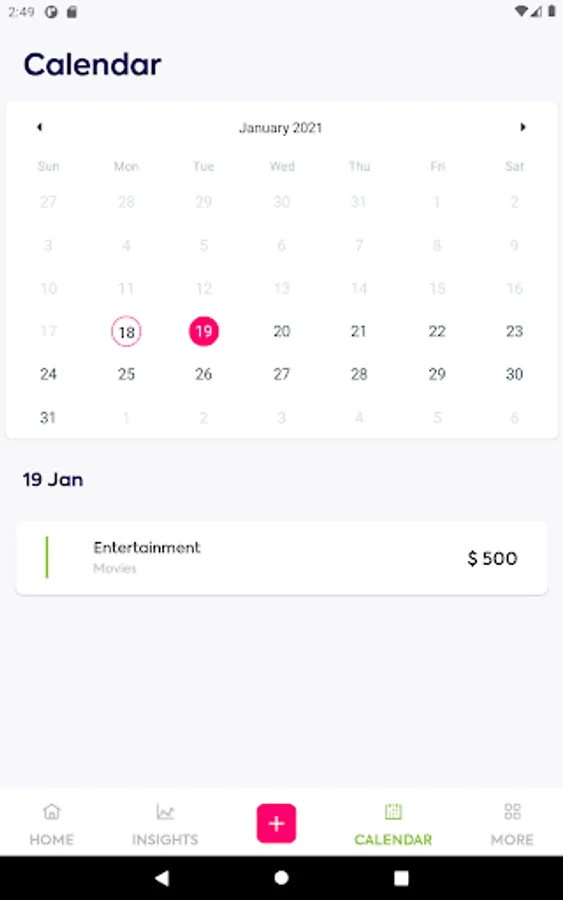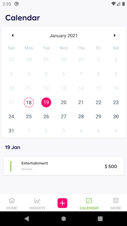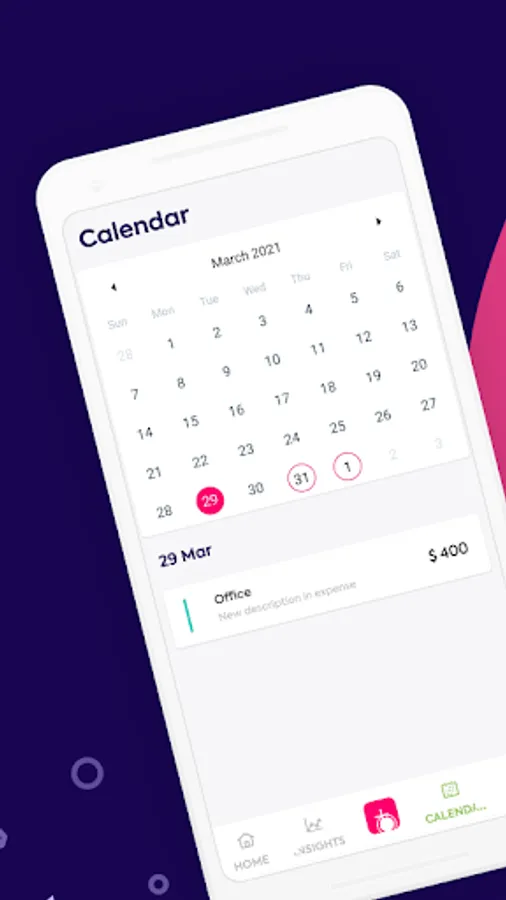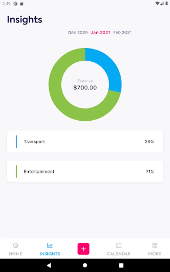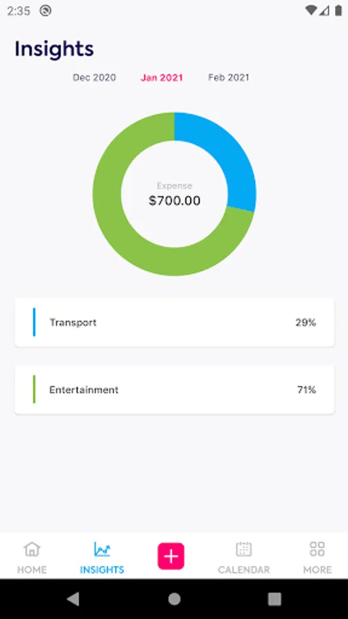 Once users make an account and login, they are directed to input their data. This starts with their Opening balance (ex: Salary) then adding in expenses. Expenses include Transport, Education, Entertainment, Food, Grocery, Home, Medical, Office, Personal, Shopping, and Travel. Once the expenses are added in, the app directs you to the calendar where it shows the expenses and the dates each on is due. Users are also able to compare month to month how much they spend by clicking on the “Insights” tab. This is where it compares by using a pie chart.