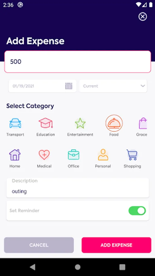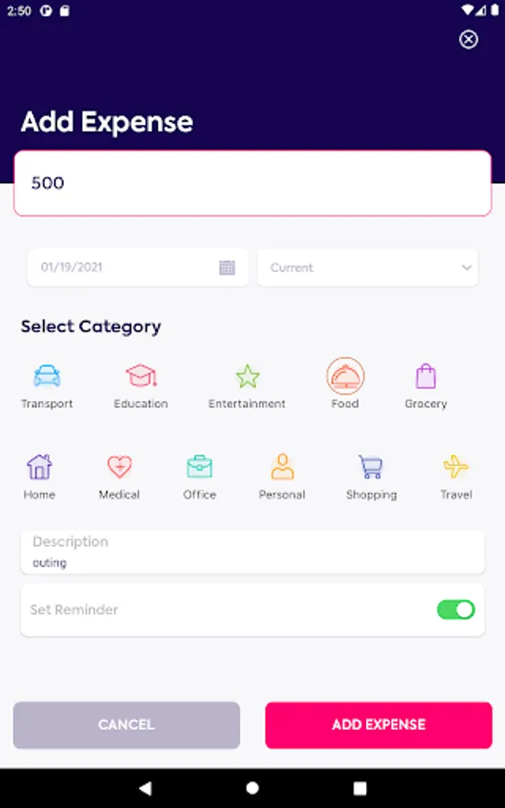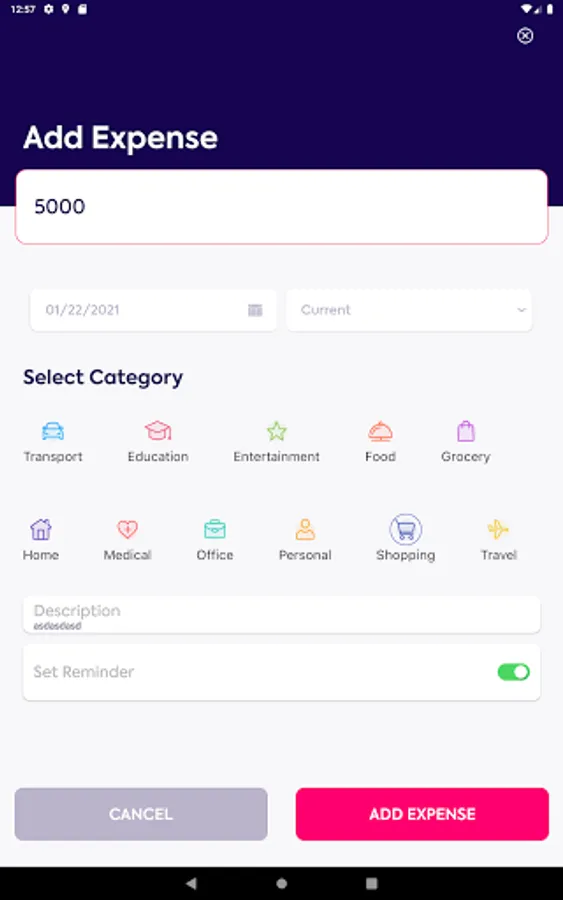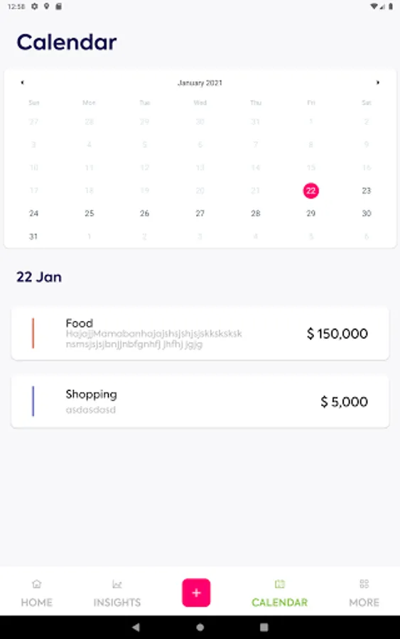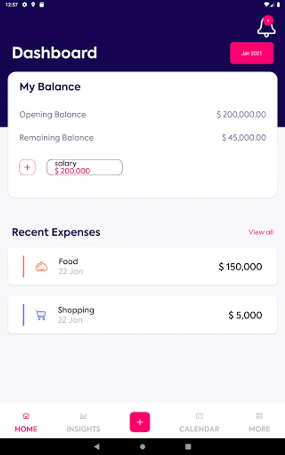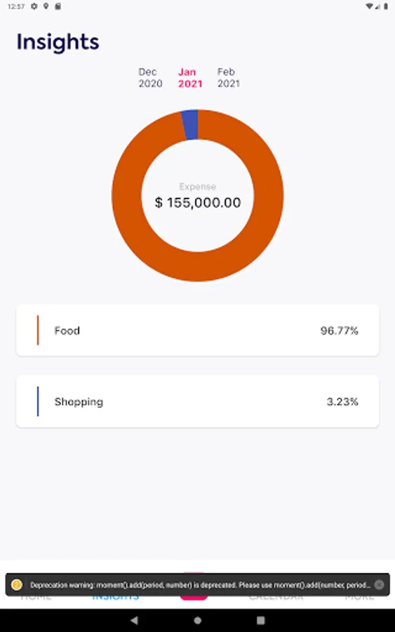 Once users make an account and login, they are directed to input their data. This starts with their Opening balance (ex: Salary) then adding in expenses. Expenses include Transport, Education, Entertainment, Food, Grocery, Home, Medical, Office, Personal, Shopping, and Travel. Once the expenses are added in, the app directs you to the calendar where it shows the expenses and the dates each on is due. Users are also able to compare month to month how much they spend by clicking on the “Insights” tab. This is where it compares by using a pie chart.