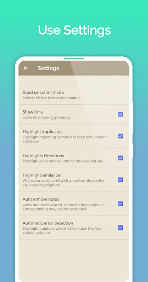 ✓ Automatic error detection of numbers that fail to match the final sudoku solution