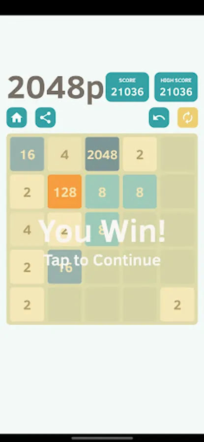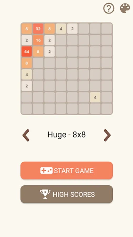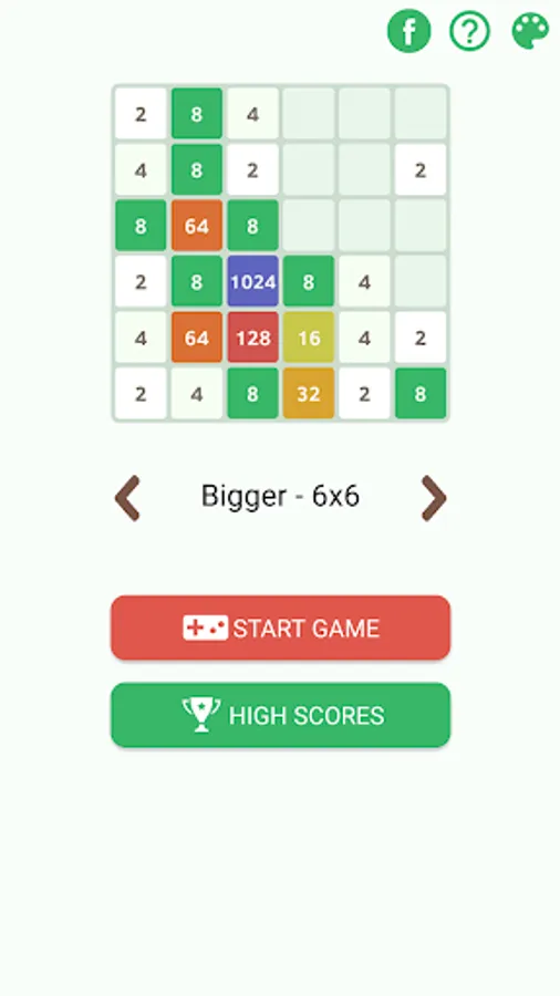 Swipe (Up, Down, Left, Right) to move the tiles. When two same numbers touch, they merge into one. After every swipe, a new tile will appear in a random empty spot on the board. Slide the cells to merge them, 4, 8, 16, 32 ... 64 ... 128 .. 256 .. 512 .. 1024 ..., when tile is created, you win!