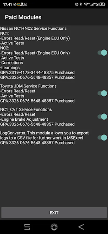 For CVTs and ATs, the function of changing the intensity of engine braking is available. For new CVTs there is function of reset fluid degradation counter.