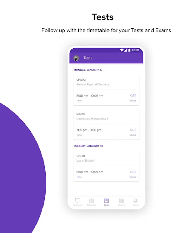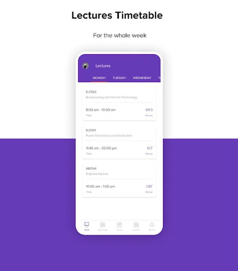 It displays scheduled lectures, test and exams with their appropriate fixed times.