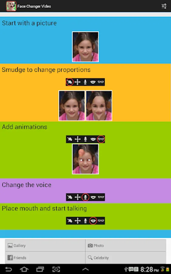 Face Changer Video lets you easily change and animate faces in photos by adding funny animated objects on top of the picture. The people in the photo can move and talk.