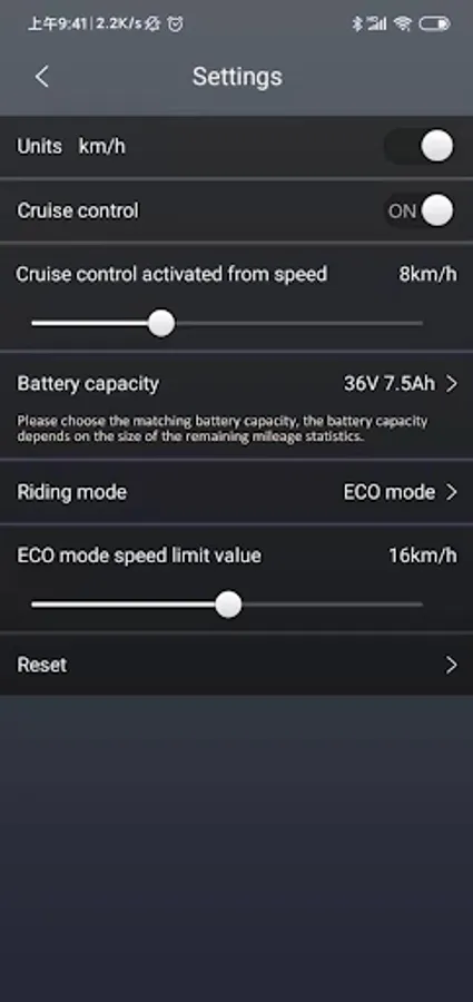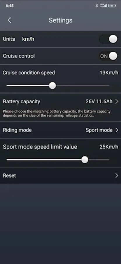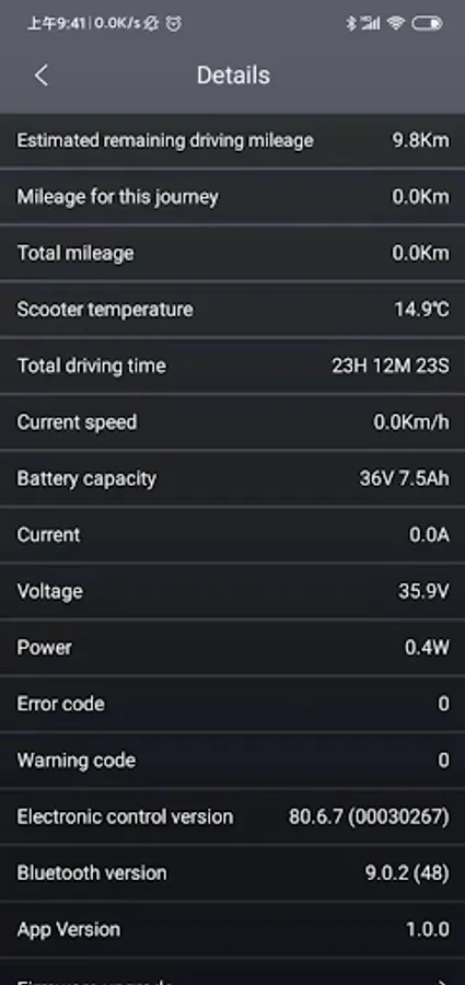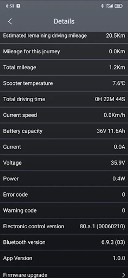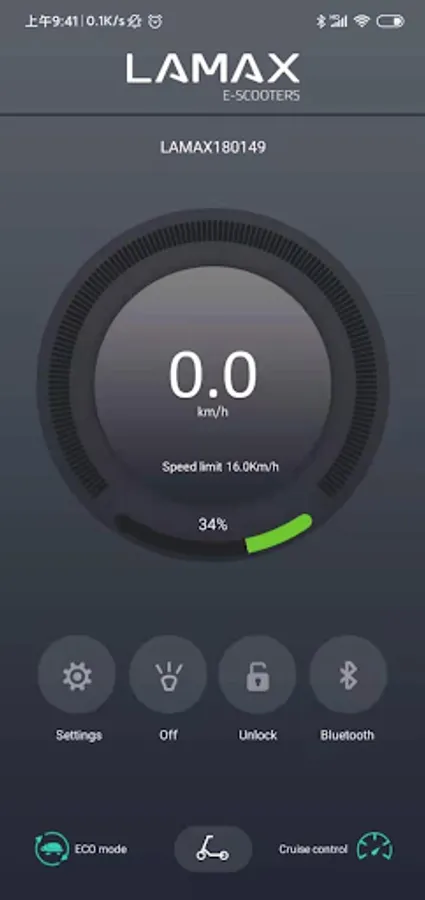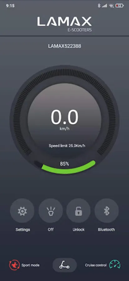 Zobrazuje podrobné informace o koloběžce. Jednoduché spárování pomocí Bluetooth. Lze měnit nastavení koloběžky a využít chytré funkce jako je tempomat nebo zámek koloběžky. V aplikaci přehledně zkontrolujete ujetou vzdálenost, stav baterie, odhadovaný dojezd nebo si zvolíte jízdní režim.