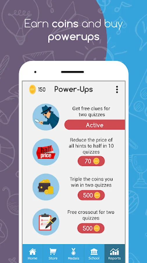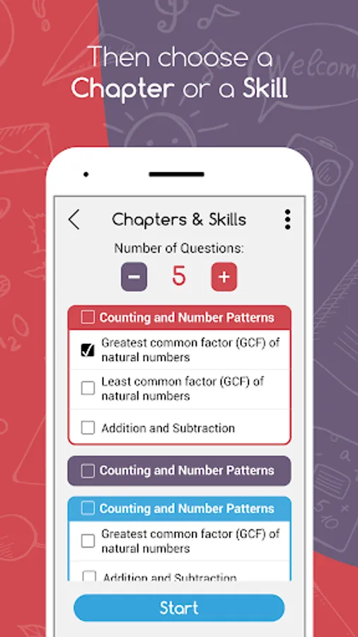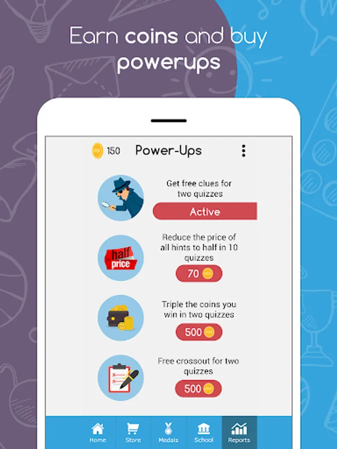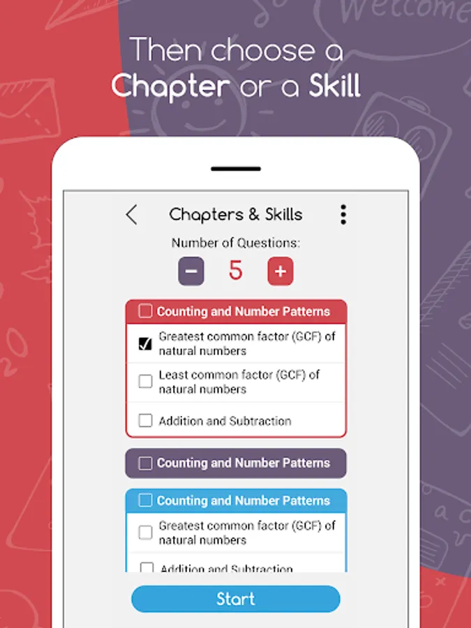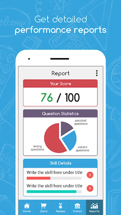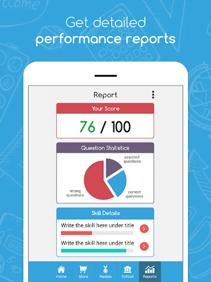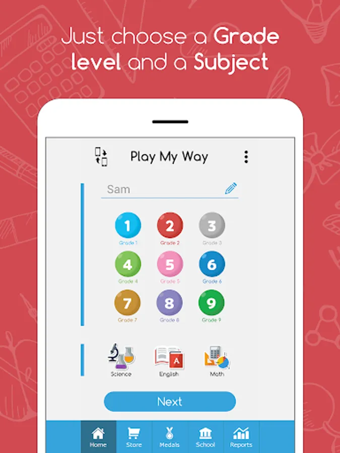 It allows you to log in to the app and start your exam in two steps. All you have to do is choose your grade level and the subject you want to be quizzed in, and then choose the specific chapter or skill. You can also view a detailed report showing strength and weakness points, power ups & rewards will be also be available, in addition to the “Link Devices” button that will allow the parent to control the kid’s device from her phone.