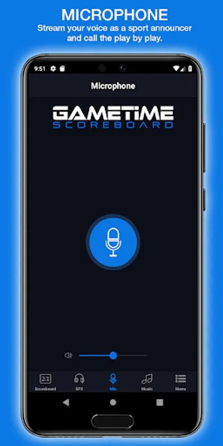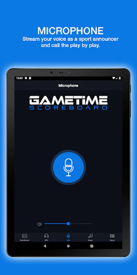 The Microphone application allows you to speak in real time using a secure, Wi-Fi network. A press of the Mic button will activate the microphone and your voice will stream to your Gametime Scoreboard’s speakers. You can adjust the volume with the bar located under the play button. To stop using the microphone, just push the button again and the transmission will stop. This useful feature allows you to address a group or do the play by play during the game.