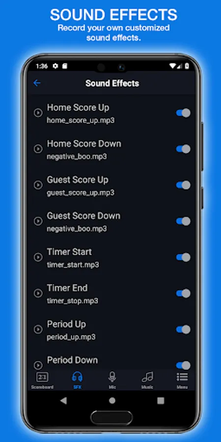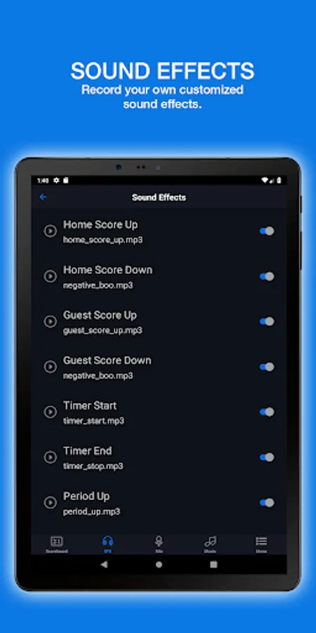 The SFX page of the app allows the user to start or stop a crowd sound effect on your Gametime Scoreboard. Once pressed, this sound effect will bring a unique crowd effect during your game. You can also upload or record your own crowd effect to truly make it a home game! The "Buzzer Only" feature shuts off all sound effects aside from the buzzer that sounds at the end of the game.