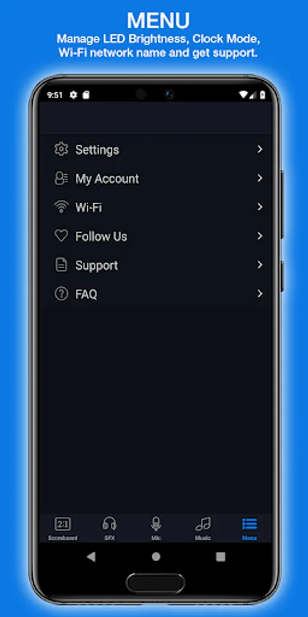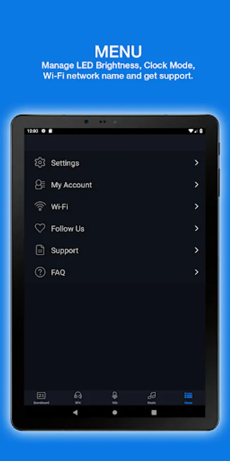 In the "Settings" page, found in the menu, you can adjust the brightness of the LED’s on the unit. It will allow you to clearly see the numbers Inside and Out during a sunny day. If you want to listen to the music only without seeing the score, you can select "Dark Mode". This will also extend the life of the battery. With the "Clock" mode, you can sync your phone or tablet time and it will be the only thing showing on the front panel.