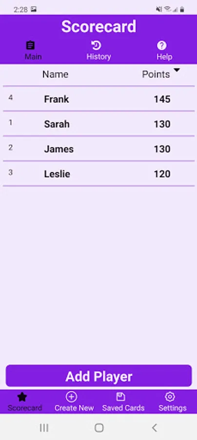 -Sort the scorecard by points or name, or revert to the original order you entered the players.
