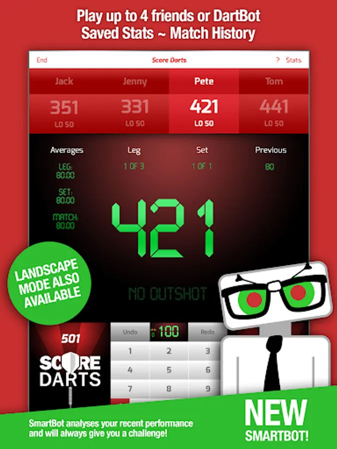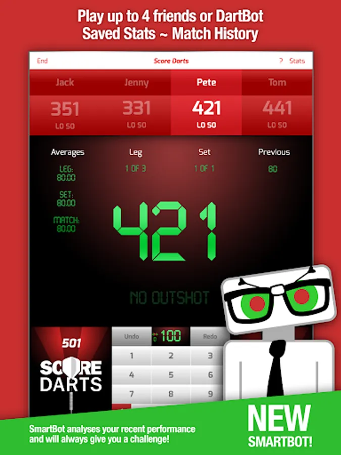 Score darts against friends or practice and improve by challenging DartBot and SmartBot, who analyses your recent performance to give you a close contest! You won't find a more advanced darts scorer AI.