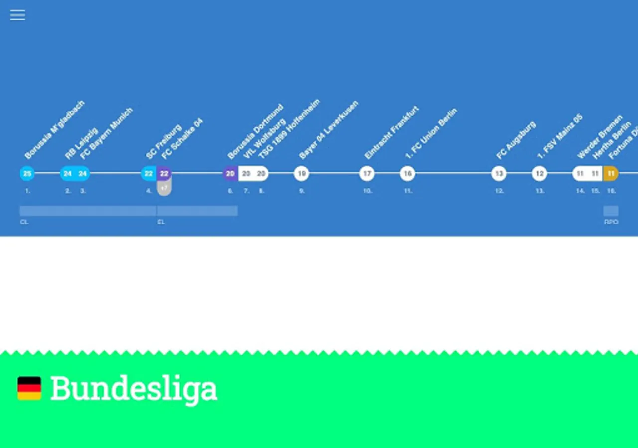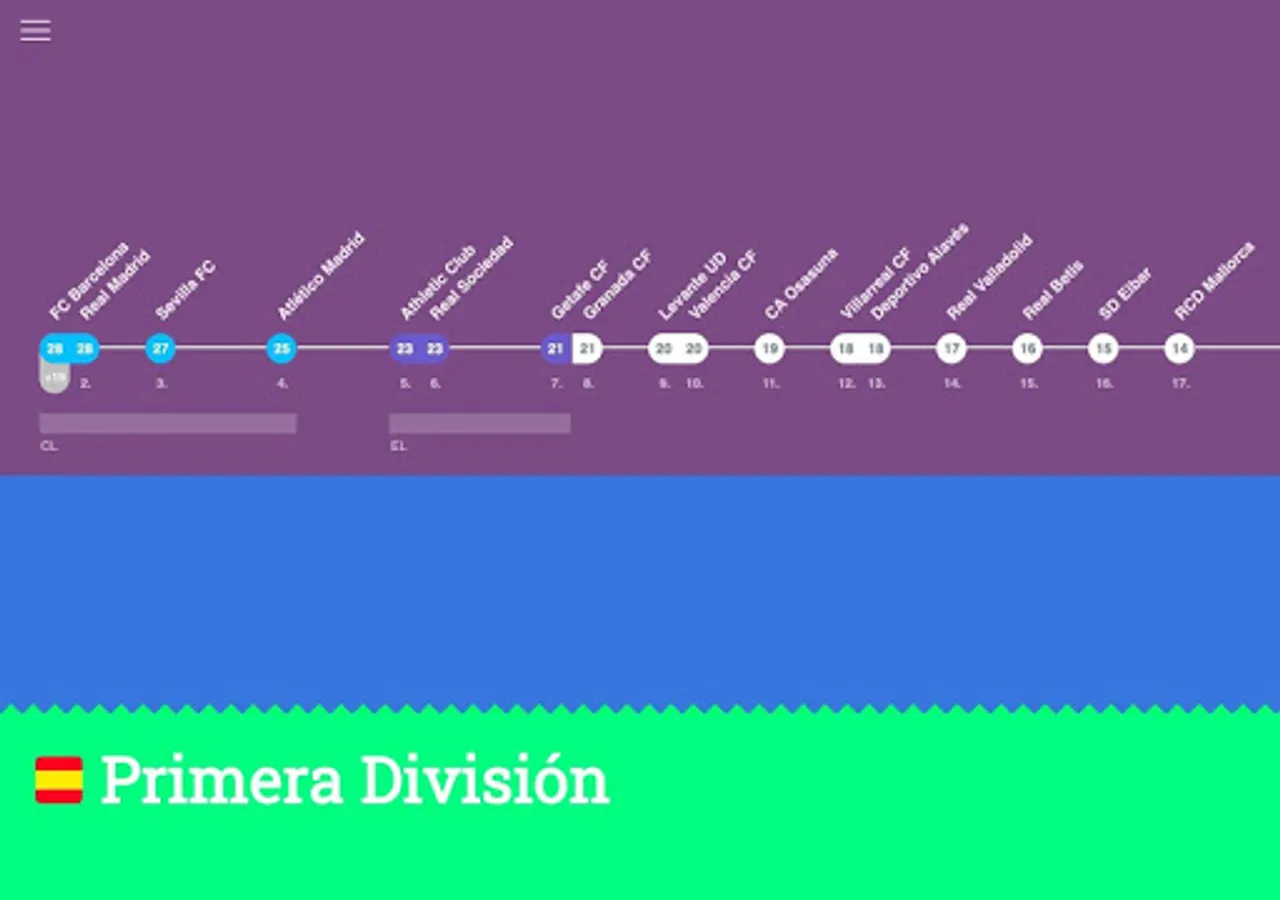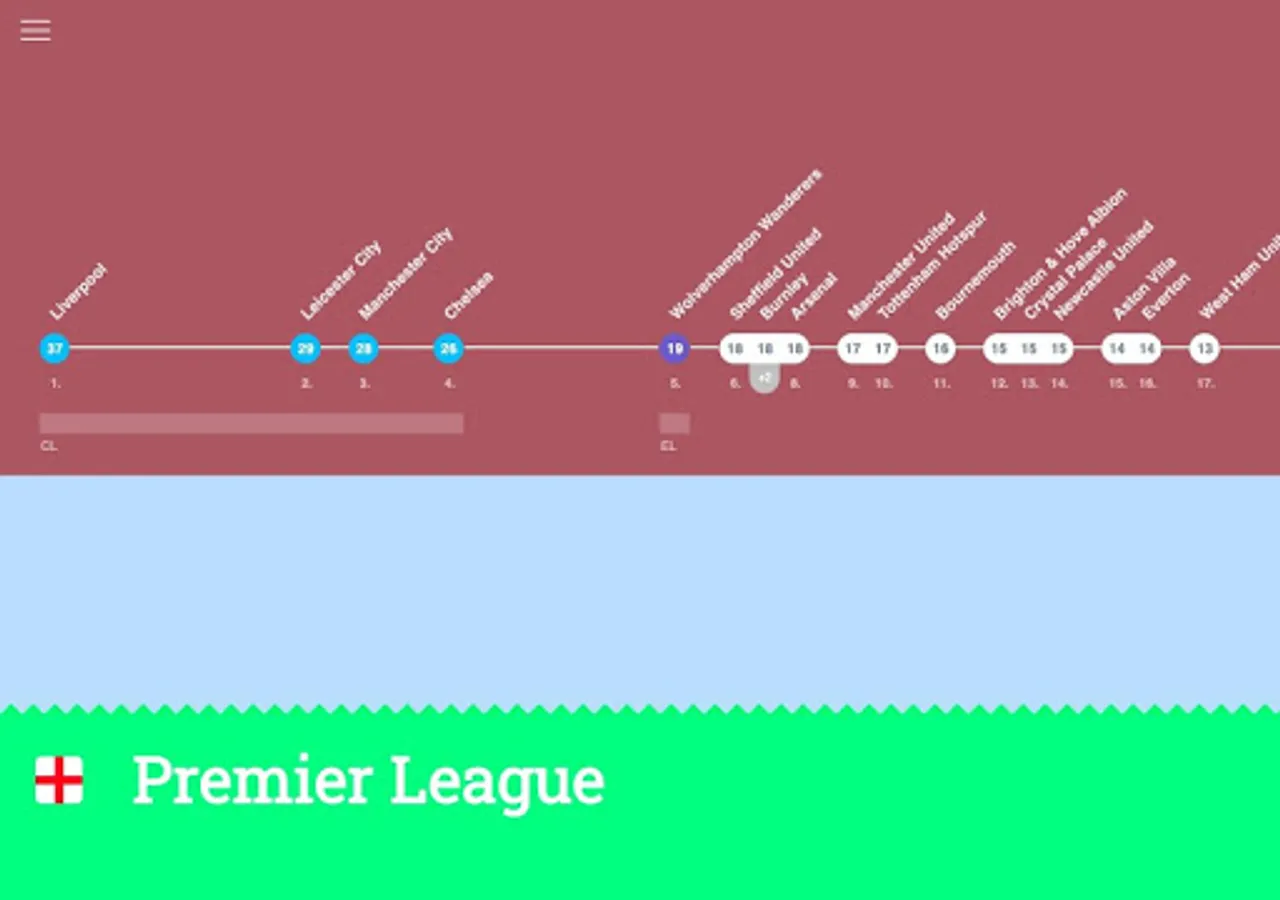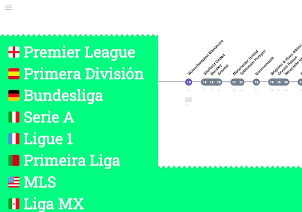 ScoreLawn shows you football (soccer) standings and fixtures in an organic and naturally mapped way. The scores are shown on a scale that visualizes the distance between each team to make them more comprehensive and easier to digest.
