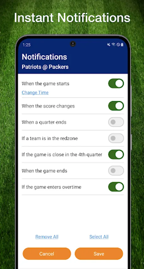 * Immediate game notifications for scores, close games, overtime, redzone alerts, and more!