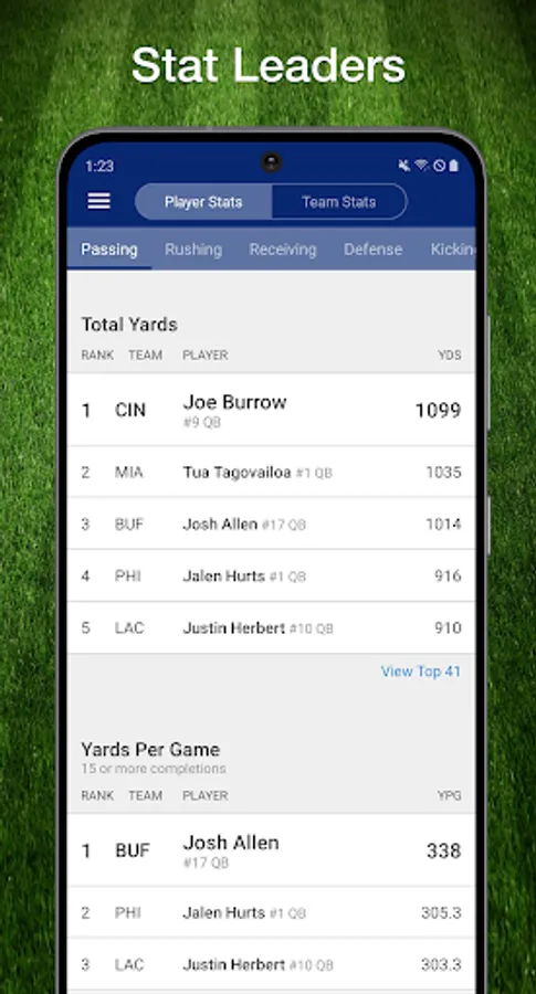 * NFL season offensive & defensive stats for teams & players, including league leaders in each category.