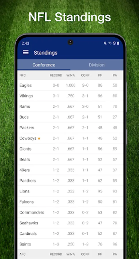 * View the latest playoff picture and team standings by division or conference.