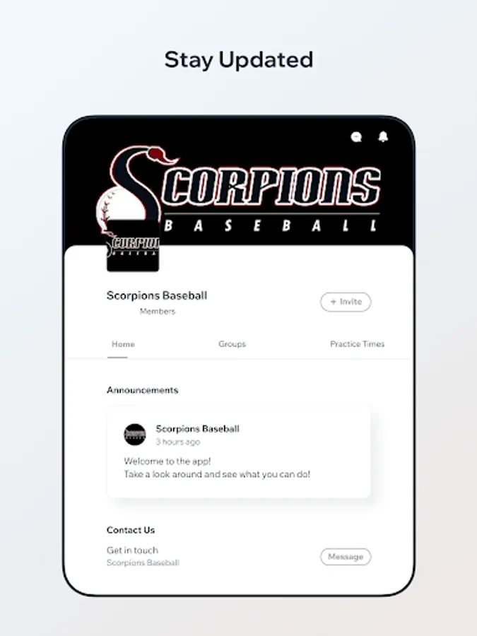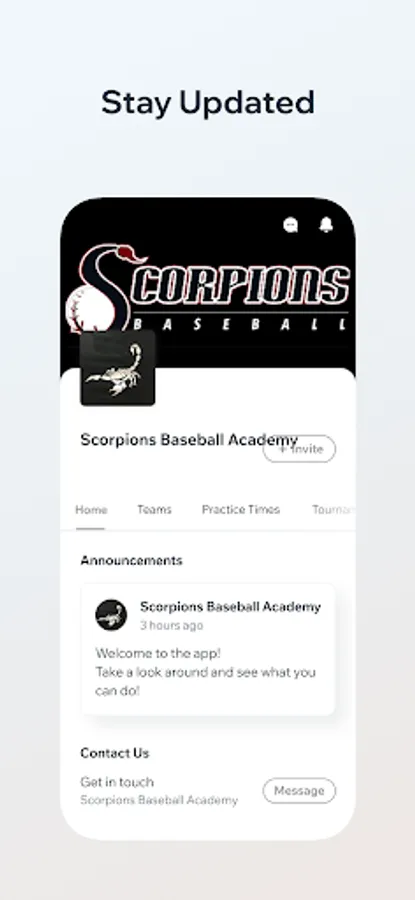 Here at the Scorpions Baseball Academy, we are excited to launch our brand new mobile app! This is a wonderful opportunity for all of our players, parents, and coaches to become even more connected and build a sense of pride in our teams and the community. Our goal is to streamline all of our communication and be as transparent as possible with all the ongoings in Scorpions Baseball! Have an awesome photo or video from a game? Share it on the app for all to see! Need to know when the next tournament is? Come check out our upcoming events page! Want to get live updates from games as they happen? Join the age group you want to follow!