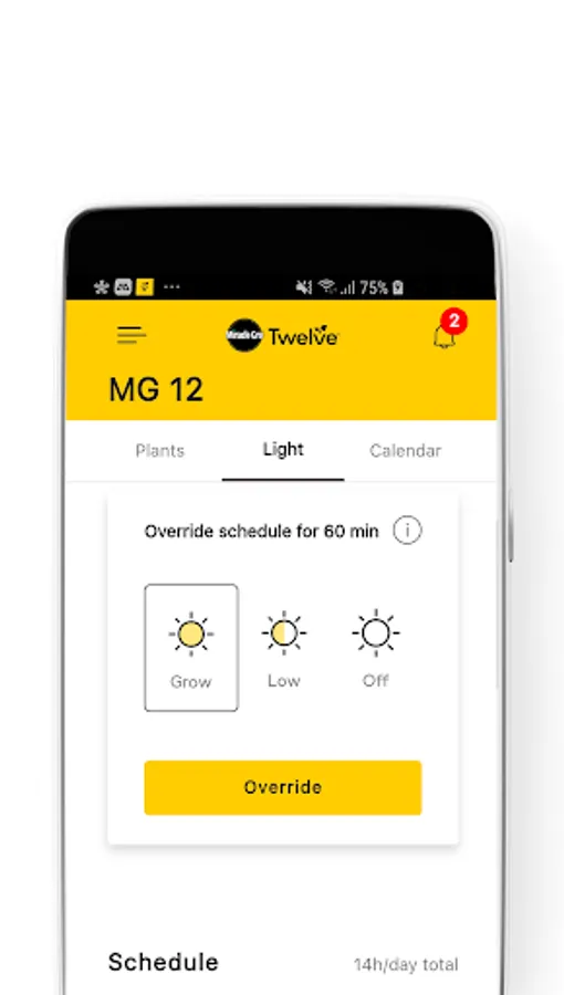 The Miracle-Gro Twelve Indoor Growing System comes with a 60W, cool-spectrum LED grow light with three different levels of light. Grow, a bright light for growing plants. Low, a dim light, not for growing. Off, no light. Easily change the mode of your light through the Miracle-Gro Twelve App to override your normal grow schedule. When you override your grow schedule, a timer will start so your normal schedule resumes automatically after 60 minutes.