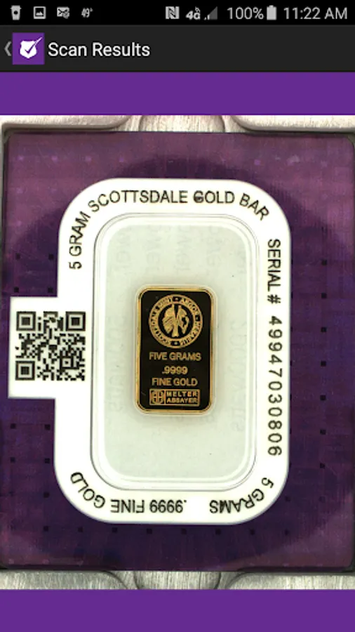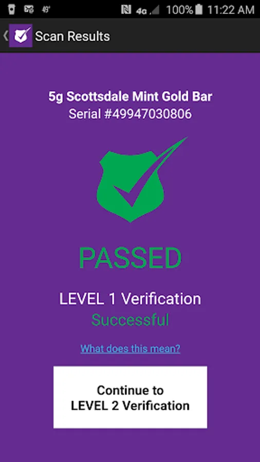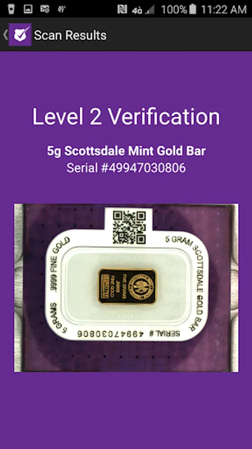 Use the Cert-Lock® app to scan the encrypted barcode on your Certi-Locked® product and enter the serial number printed on the packaged. The Certi-Lock® app will instantaneously verify the authenticity of the package. You will also have access to Level 2, which will show a picture of your coin/bar at the time it was sealed. Not just a stock photo, but your exact item!