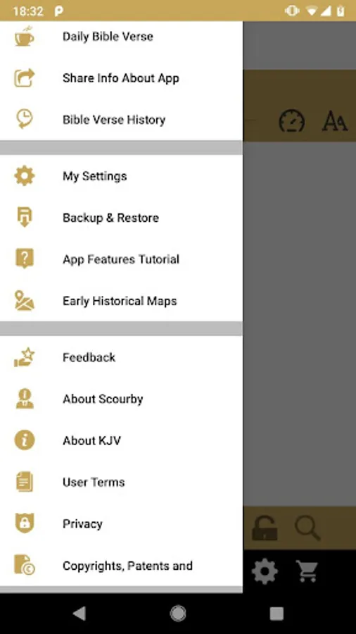 * Maps, Notes, Bookmarks, Bible Verse History, About Scourby, Feedback and More.