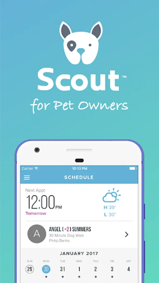 The Scout for Pet Owners app is a companion application to the Scout platform. It's been crafted specifically to allow Pet Owners to easily manage their appointments, view walk maps and photos from their walk and much more.