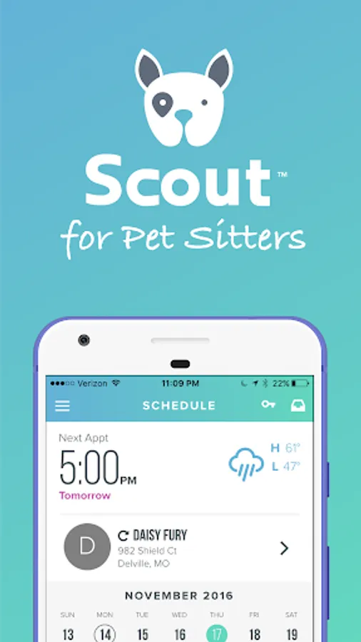 The Scout for Dog Walker & Pet Sitters app is a companion application to the Scout platform. It's been crafted specifically to allow dog walkers and pet sitters to do their job with ease.