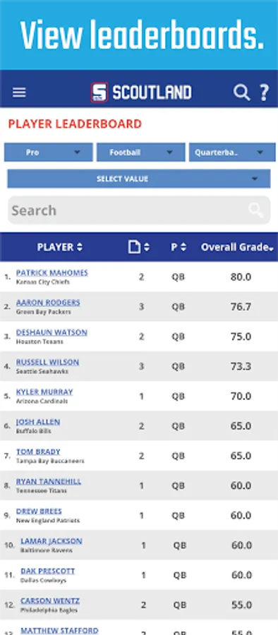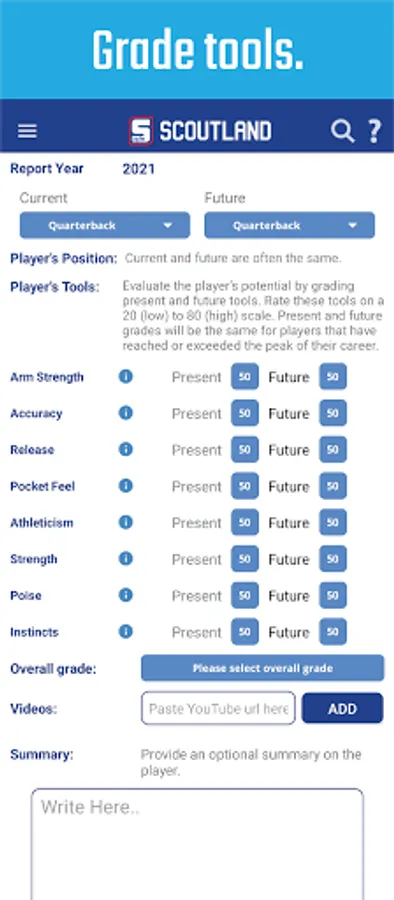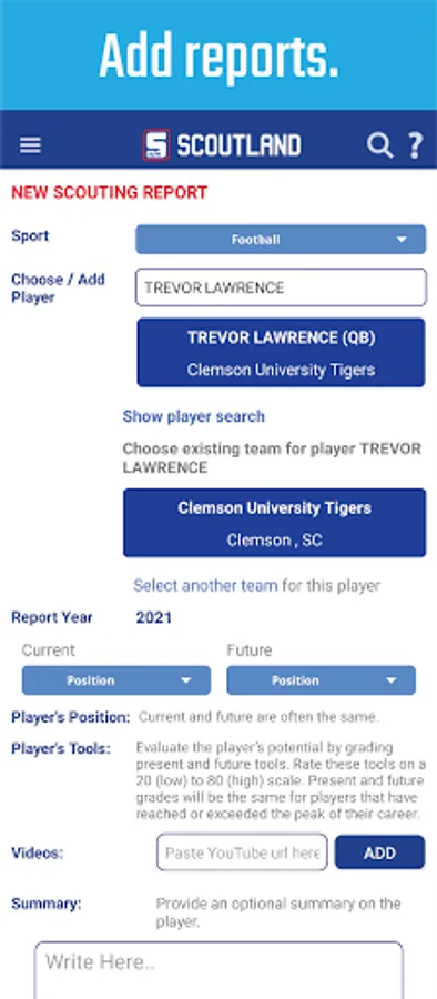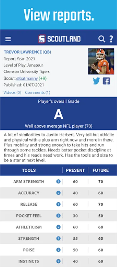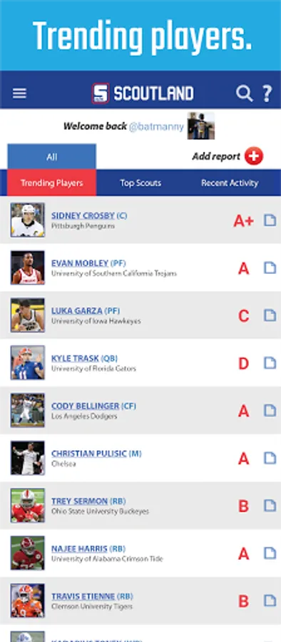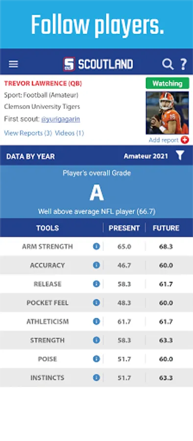 Scoutland is the definitive community scouting app created by real professional scouts. Write up any amateur prospect or any professional player from the five major sports in the United States - football, basketball, baseball, hockey and soccer using the 20/80 scouting scale. Follow your favorite scouts and players. This immersive scouting experience will change the way you watch sports.
