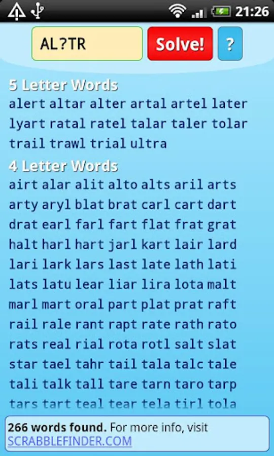 Word Solver is a handy cheat and solver application for crossword games and word jumbles. It uses a large open-source Dictionary to find all the possible words you can make from the tiles you have.