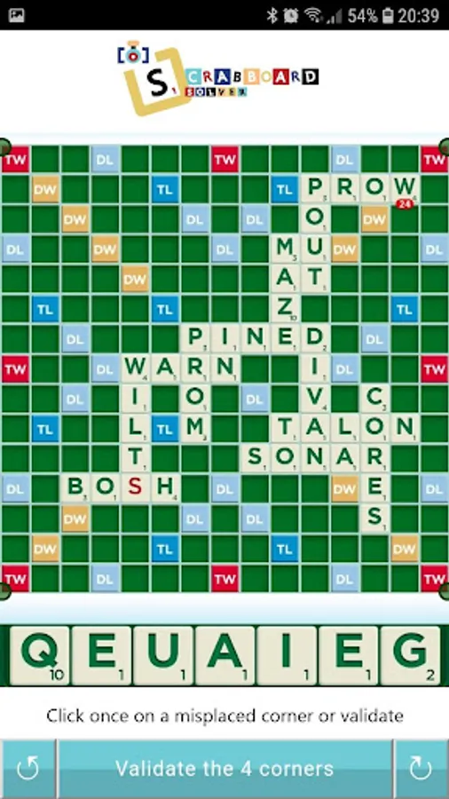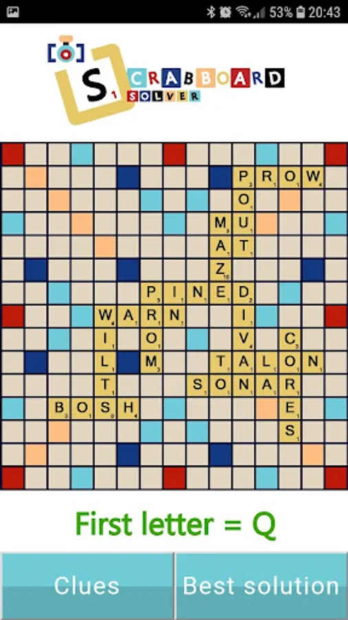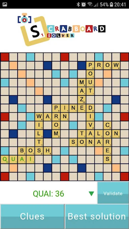 Scrabboard Solver is the only scrabble solver application that finds the best solution of an actual Scrabble board from a camera image or a screenshot of your scrabble application (tested with classic words plus, ea scrabble, words with friends 2, words with friends messenger, wordfeud, Scrabble Go, Literati, Word Domination and Word Crack).