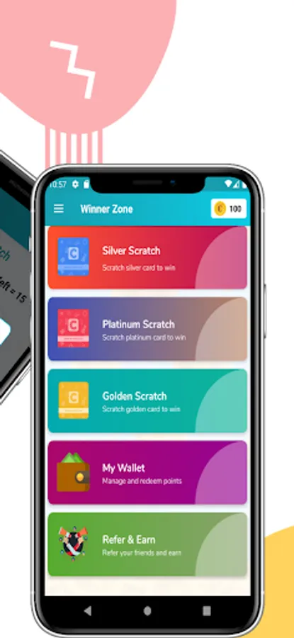 1. Gold card , 2. Diamond card 3. Silver card 4. platinum card and user can Play any Scratch card Coupon and Luck By Chance To win.