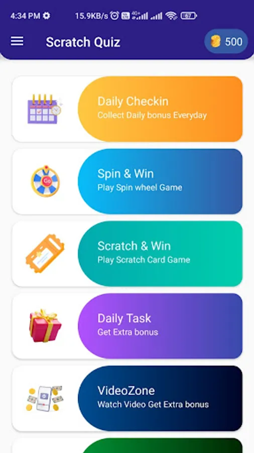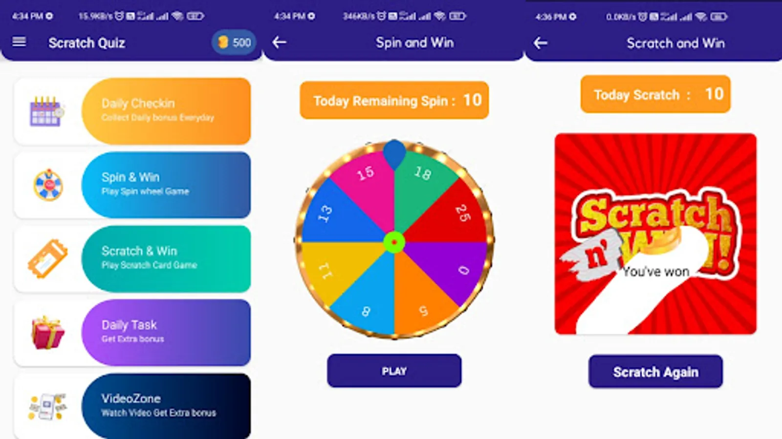 In this app you can play daily spin and get virtual points for fun and also can get scratch cards to get more points. Apart from these there is quiz section where you can play daily quizzes and get rewards for fun.