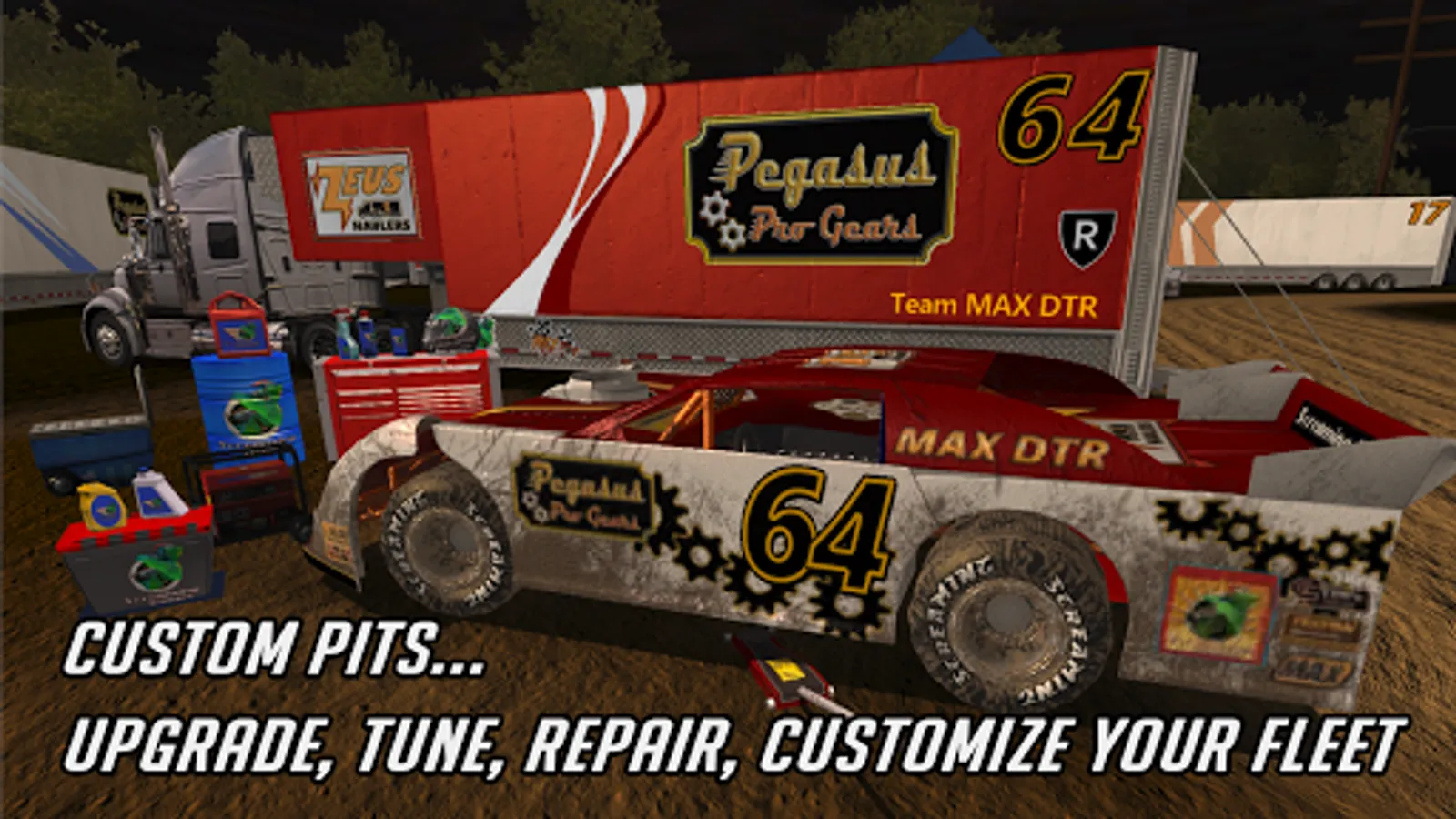 AMAZING CARS: Race 7 awesome car classes (4 cylinders, stocks, modified cars, big blocks, late models, sprints and winged sprints). Advance in races and expand your fleet of dirt track racing machines. Tune, maintain, and customize your cars in the pit, and hire mechanics to help fix your cars between races. Obtain bigger trailers to upgrade cars with higher performance parts