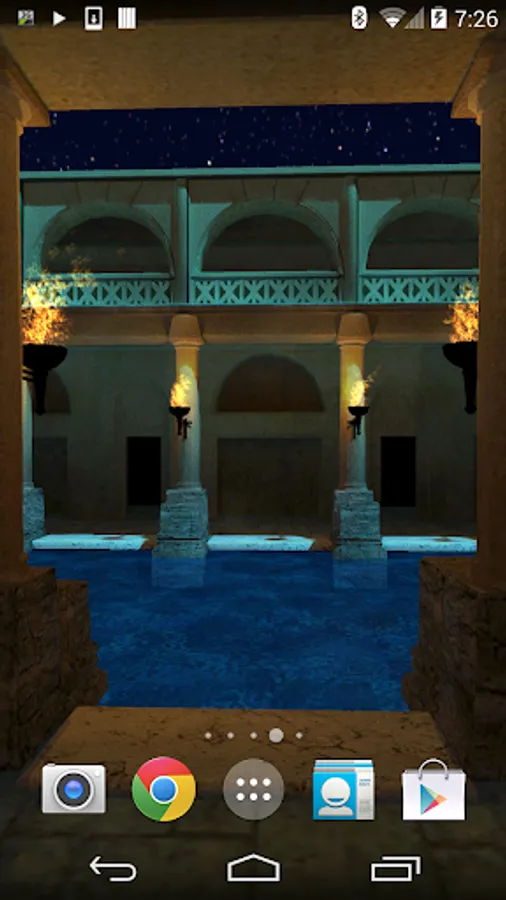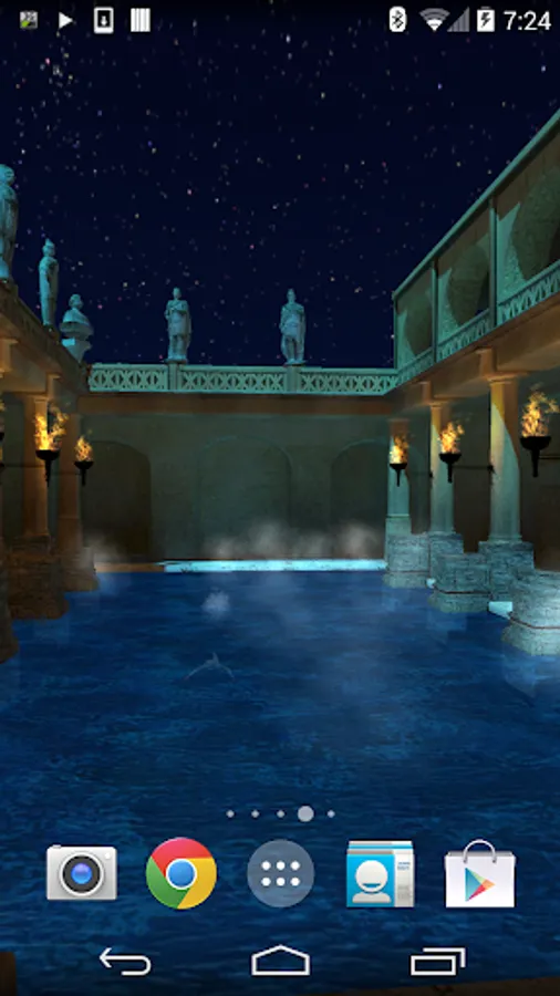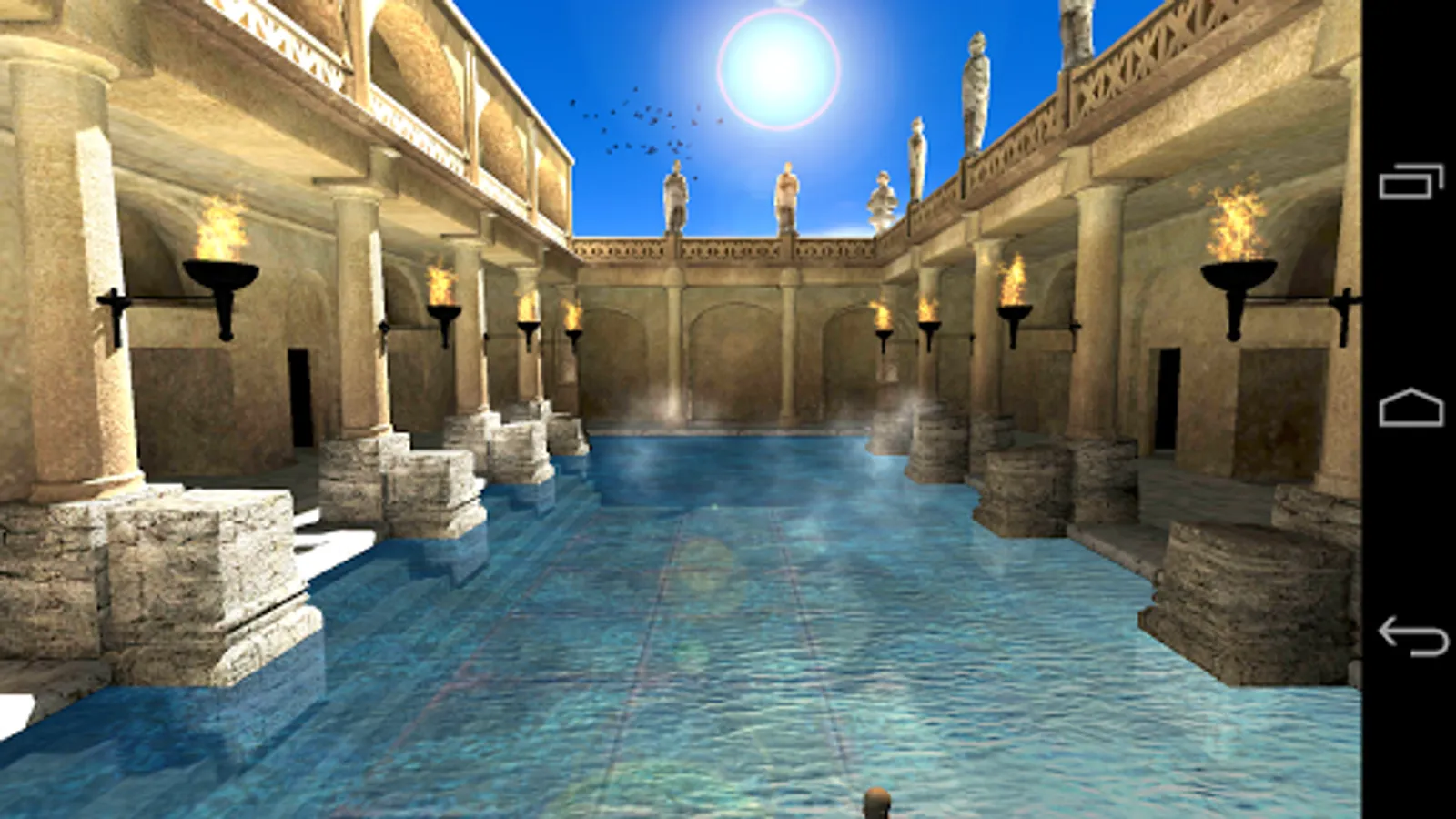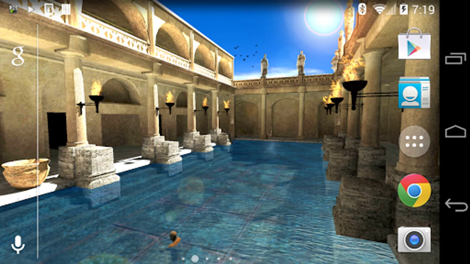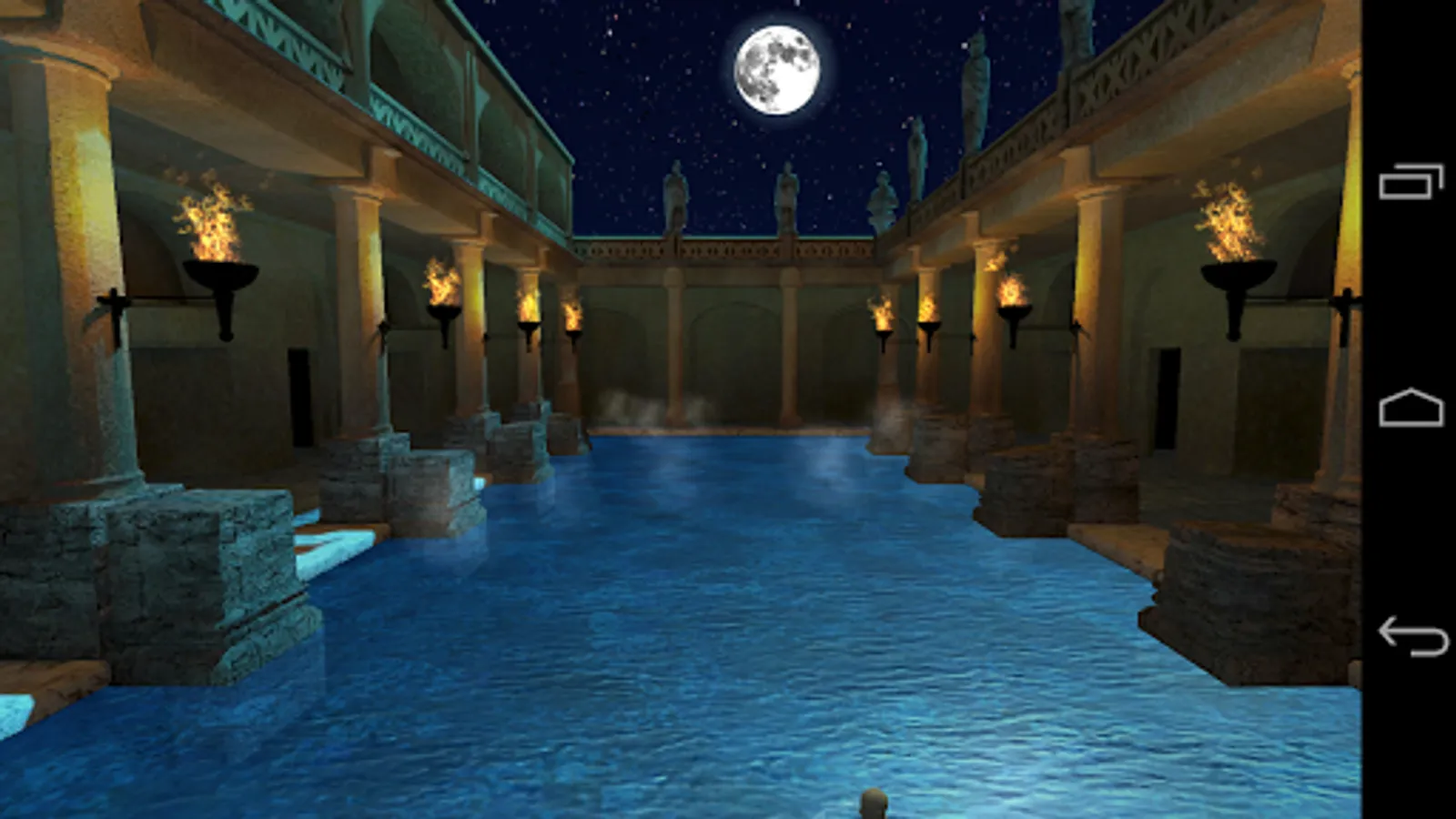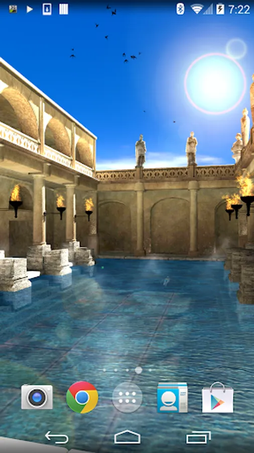 With a beautiful blue sky in the day, a sparkling starry sky at night, cool refreshing pool water, the warmth of fiery torches to the left and right of the water, and a playful flock of birds flying overhead, this live wallpaper promises a calm, tranquil environment for you to enjoy on your device.
