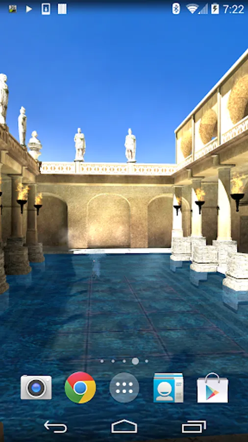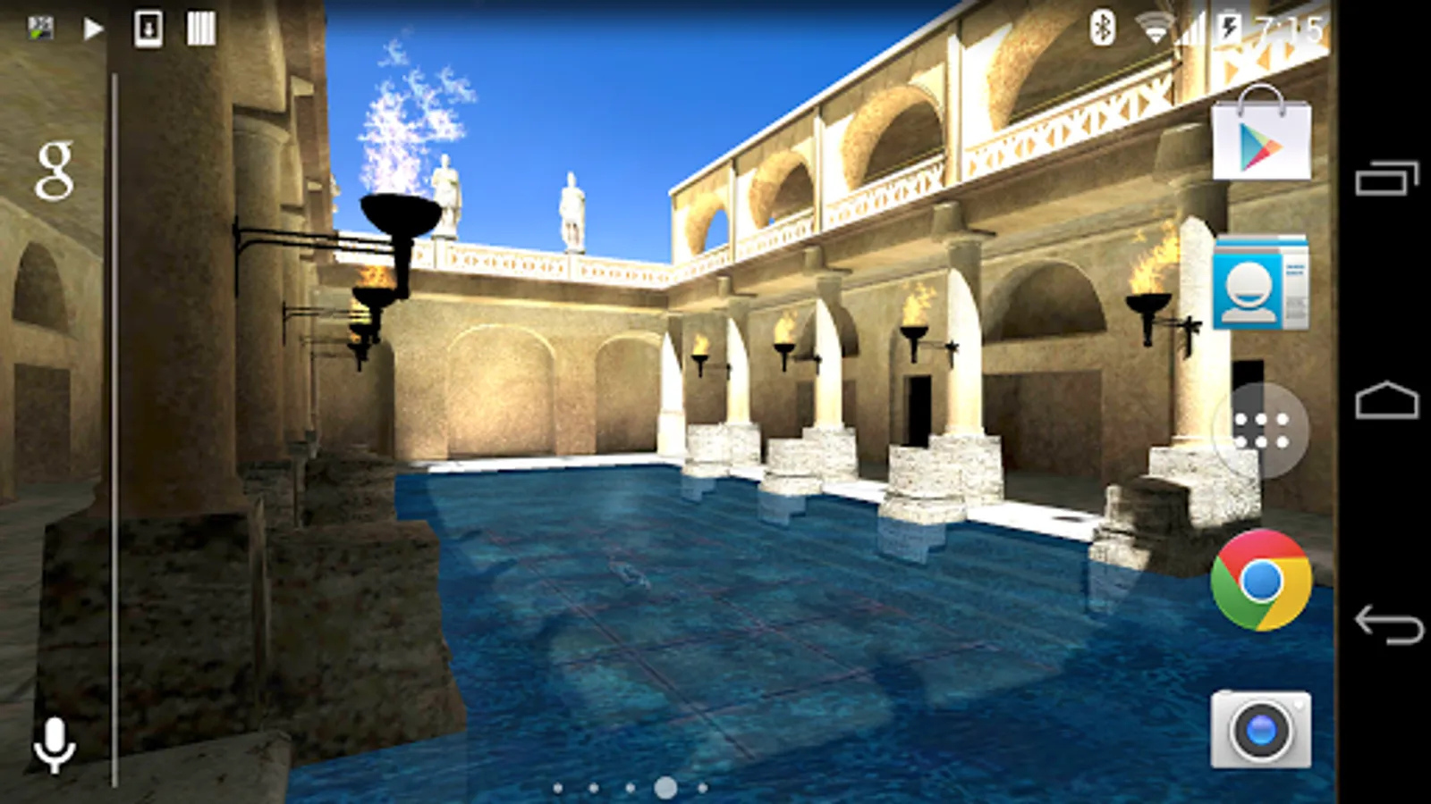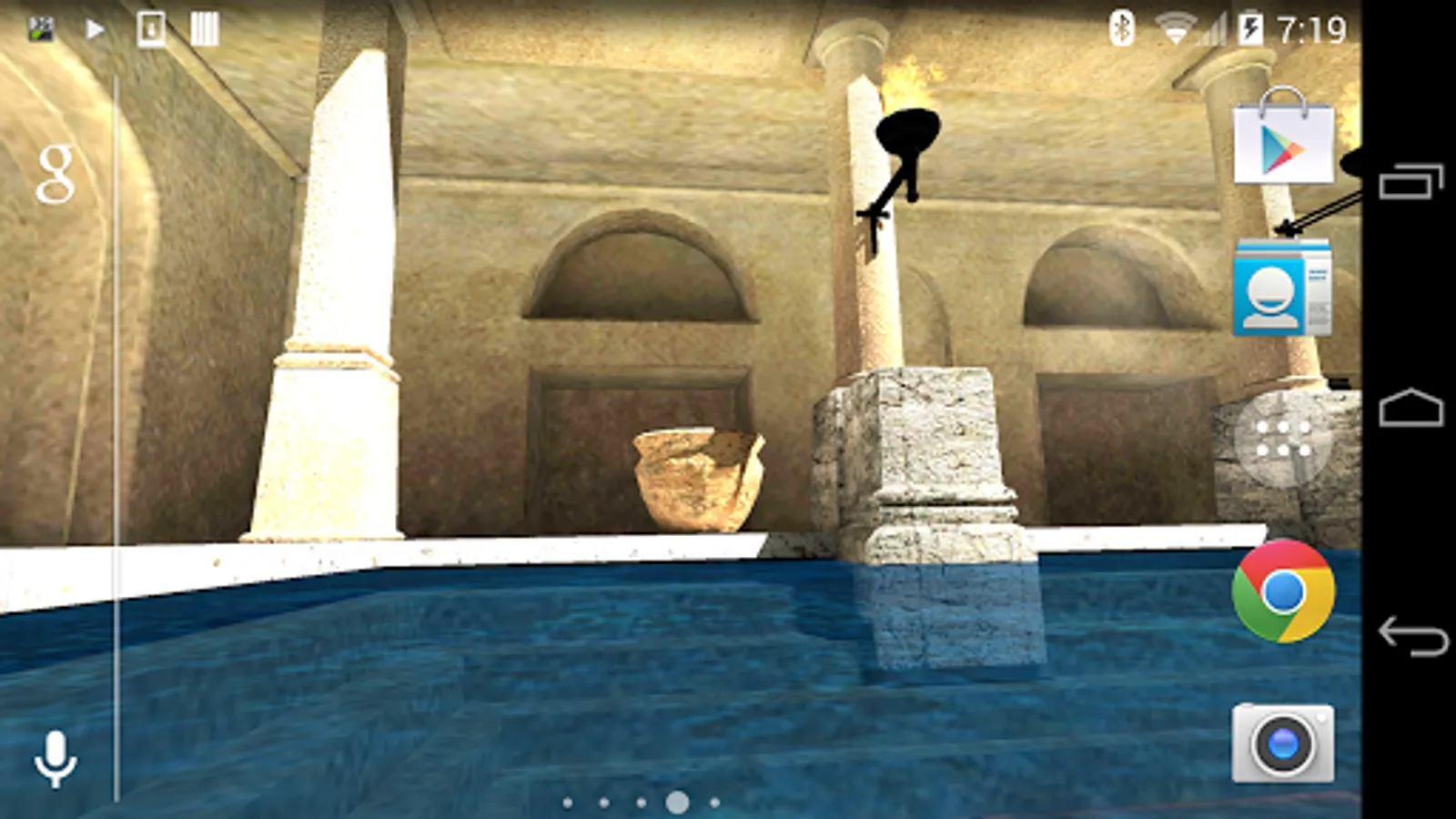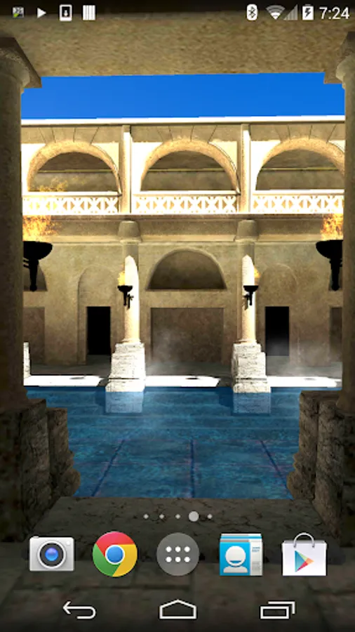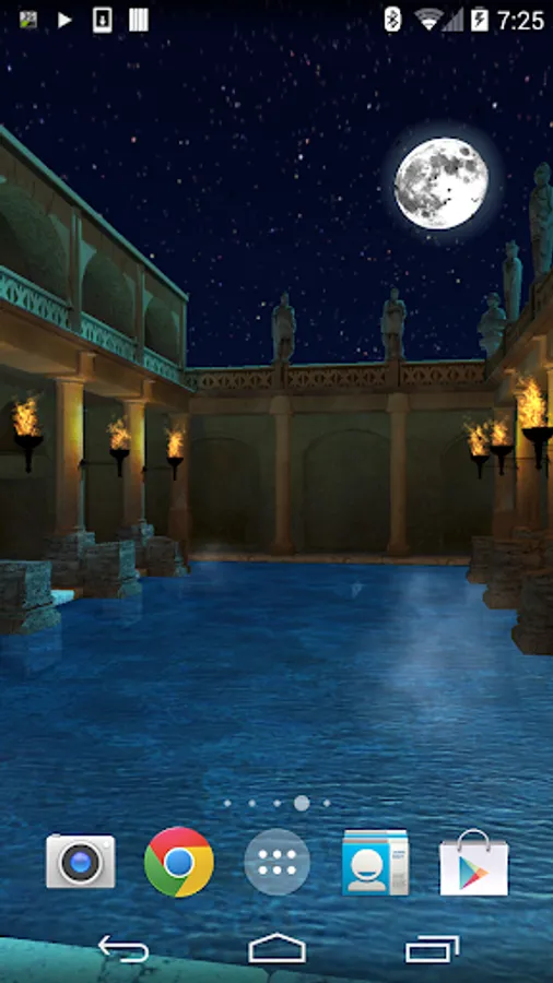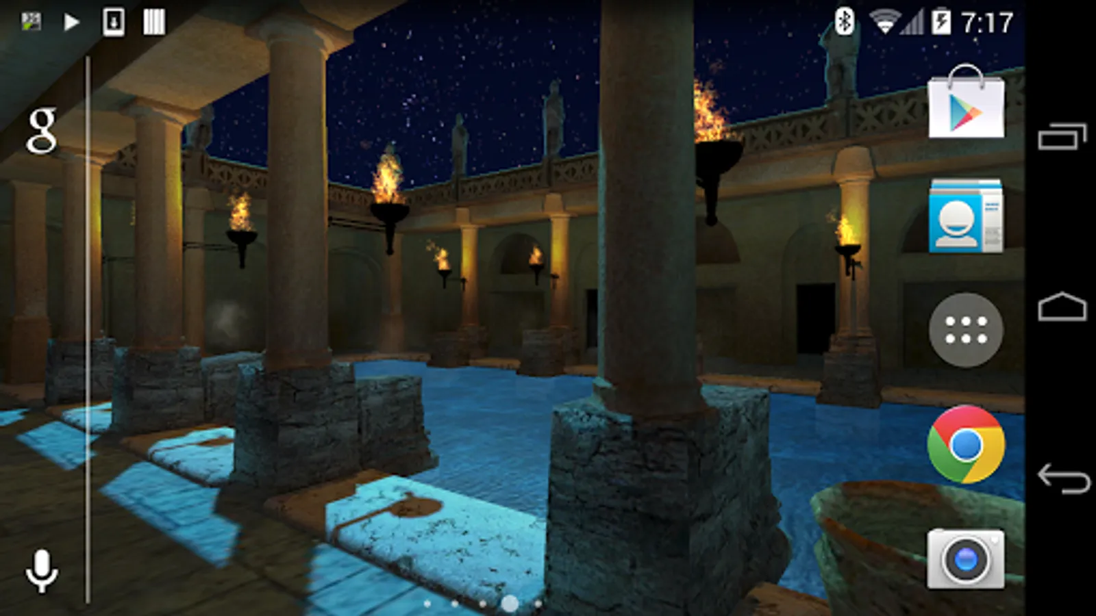 With a beautiful blue sky in the day, a sparkling starry sky at night, cool refreshing pool water, the warmth of fiery torches to the left and right of the water, and a playful flock of birds flying overhead, this live wallpaper promises a calm, tranquil environment for you to enjoy on your device.