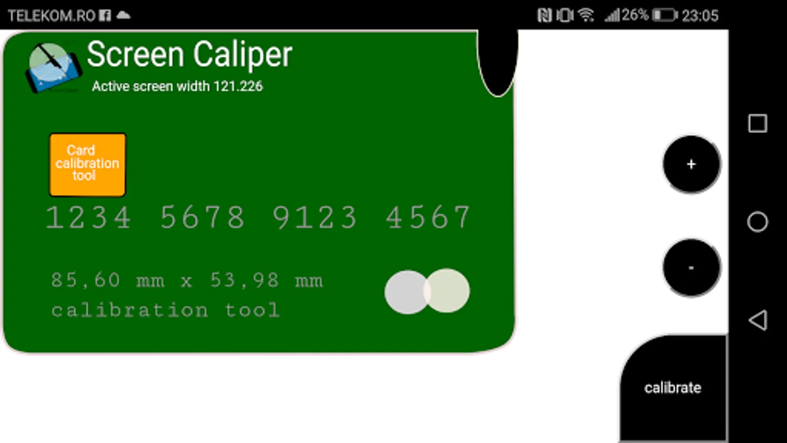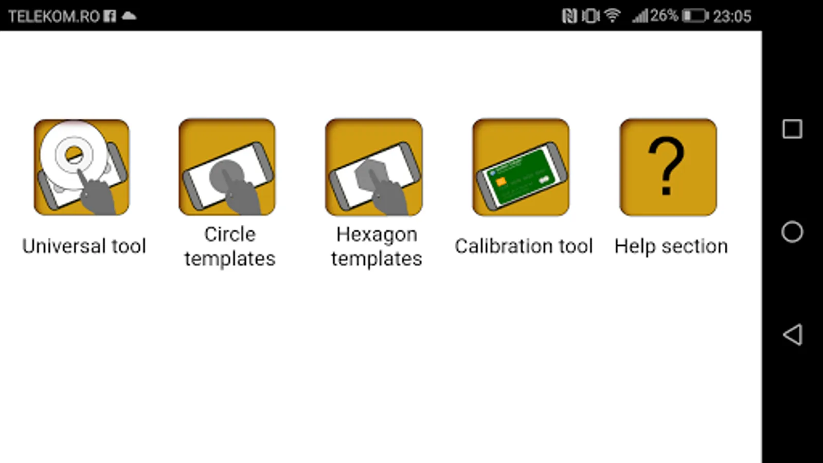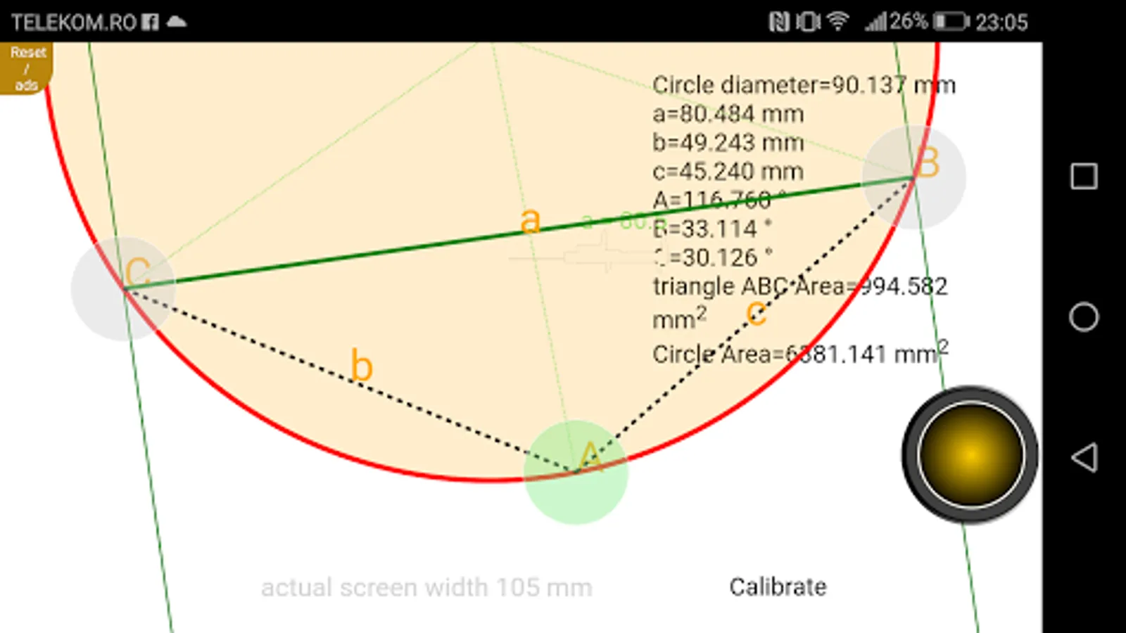 Calibrate by specifying the screen's active width. Touch the triangle tips and pull lightly to adjust the circle size according to the measured object. Use only one touch point. You can measure diameters, lengths, angles but also areas of triangles on the screen.
