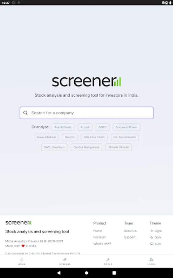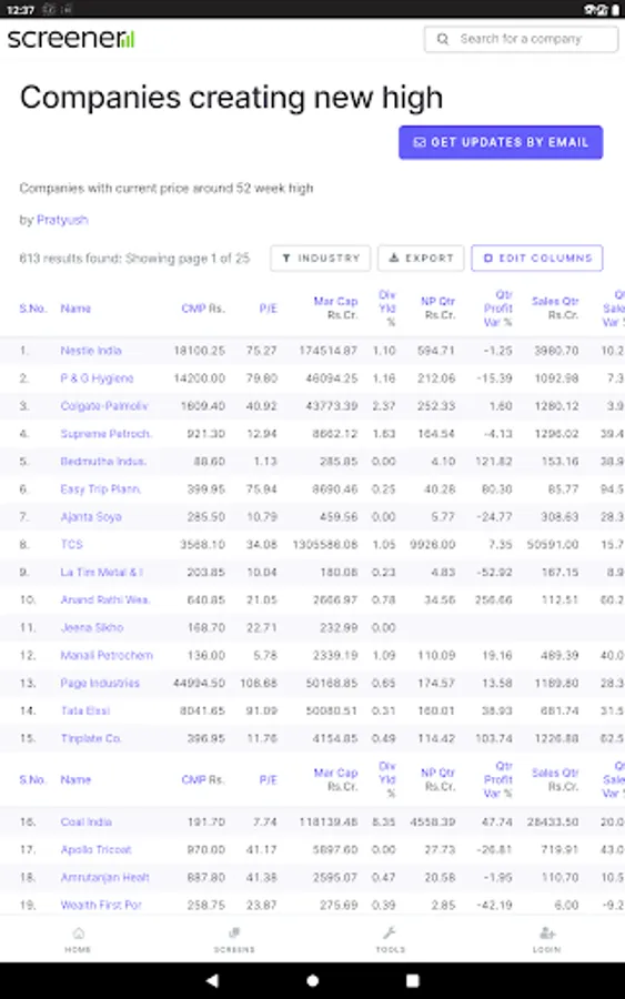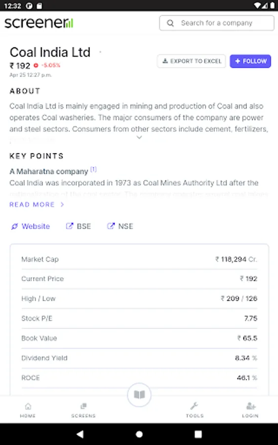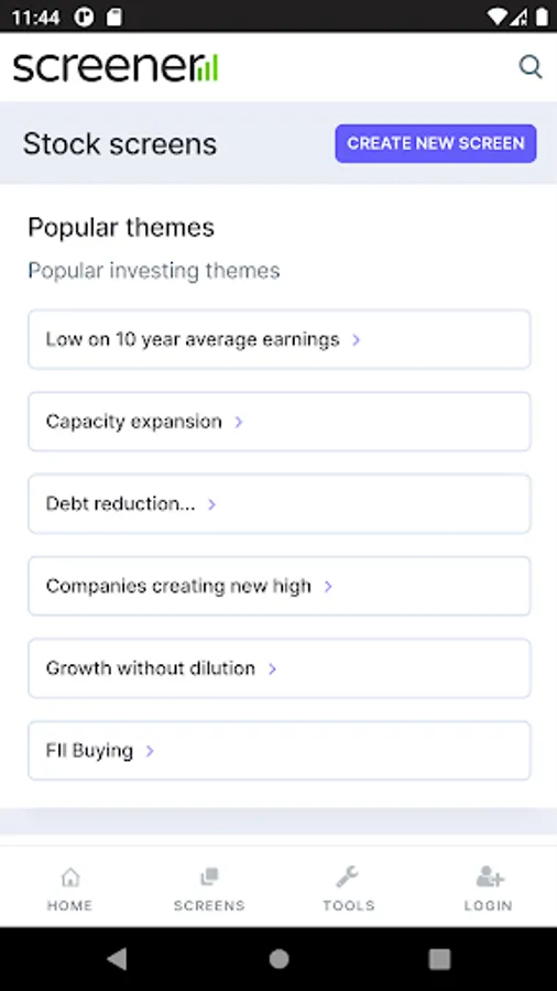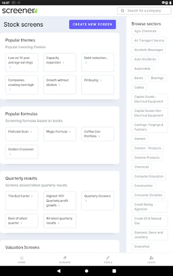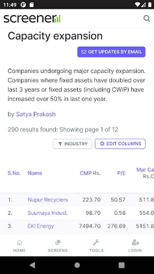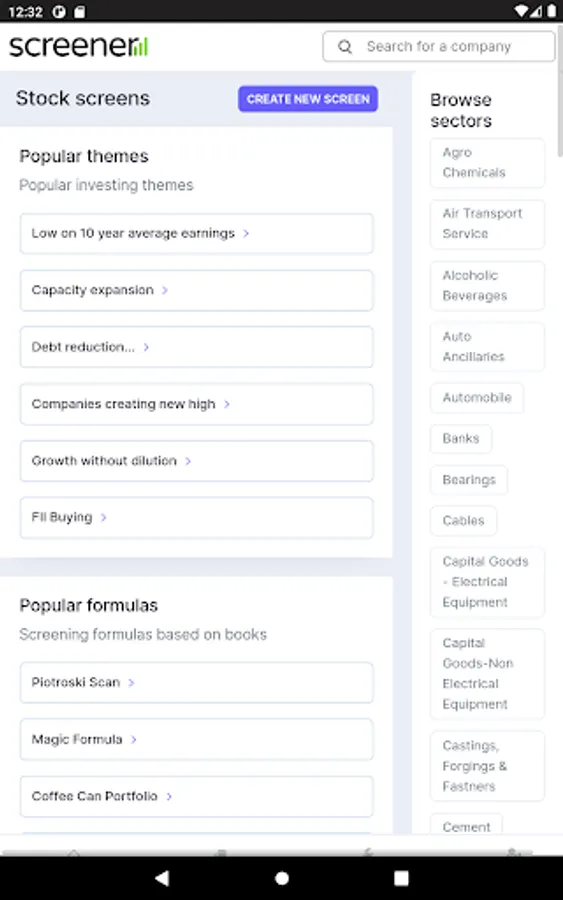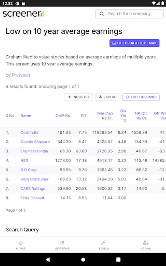 Screener provides data of listed companies in India. Use it to find new stock ideas. You can screen companies based on parameters like PE ratio, ROCE, 10 years growth, market cap and sectors.