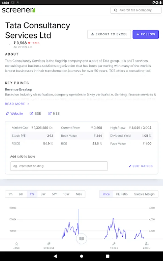 Screener also provides a quick overviews of the companies 15 year performance. You can view the profit and loss, balance sheets and cashflows statements tabulated across 10+ years.