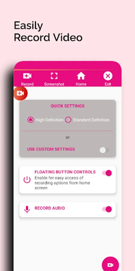 Screen Video Recorder - Recorder supports recording game screen in the highest quality, 1080p, 12Mbps, 60FPS. Of course, you can record screen with adjustable resolution(240p to 1080p), quality, and FPS(15FPS to 60FPS).