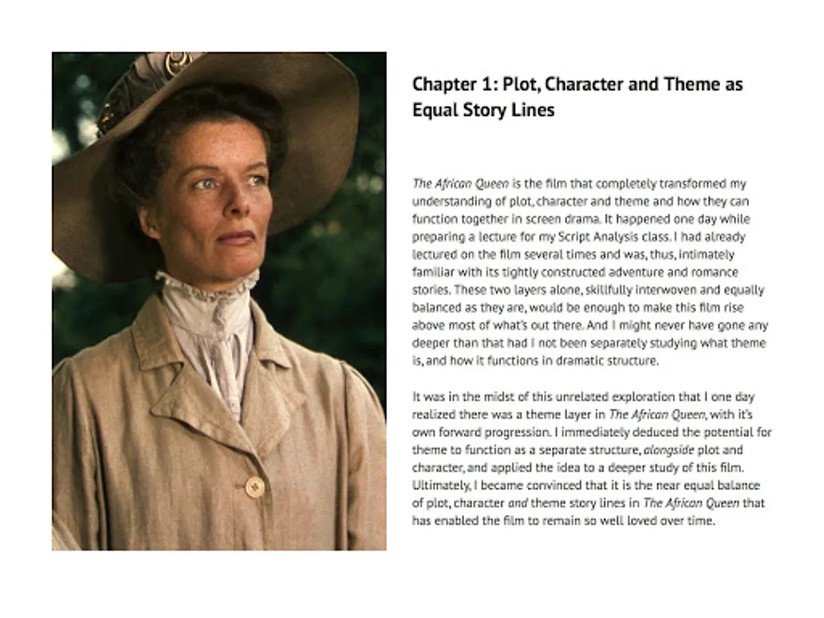 Our first two screenbooks analyze the story structure of The African Queen and Thelma & Louise. We are currently working on our third ebook analyzing Kramer vs. Kramer. Future ebooks will cover titles such as Traffic, The Crying Game, Chinatown, Pulp Fiction, Fargo, Double Indemnity and Sunset Boulevard. For more information, visit www.screentakes.com.