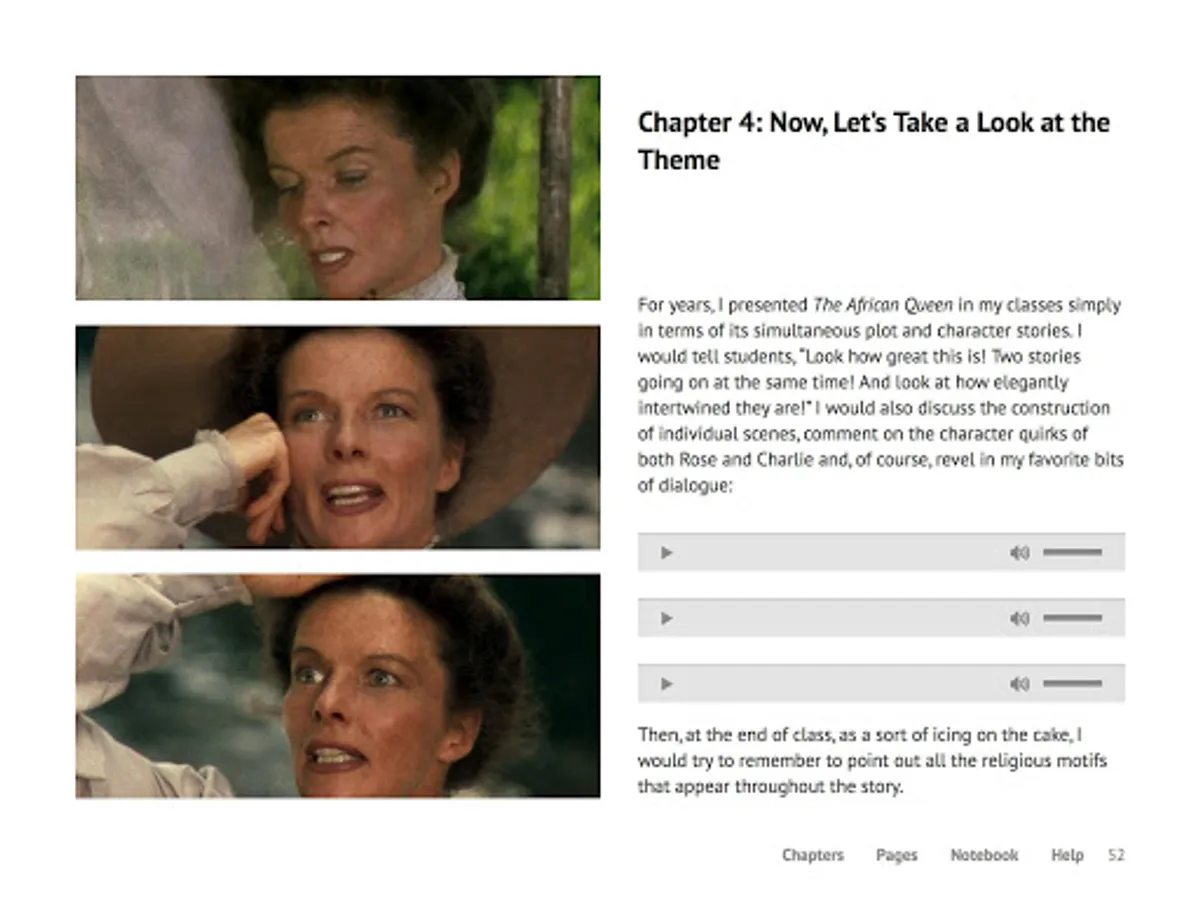 Screentakes screenbooks offer screenplay analysis of time-tested great films in an innovative learning experience that uses text, photos, video, audio and interactive graphics. Unlike the “enhanced ebook,” in which the media elements are supplemental to the text, in our screenbooks the reader engages with the media as an integral part of the narrative flow. They are reading experiences designed for the screen.