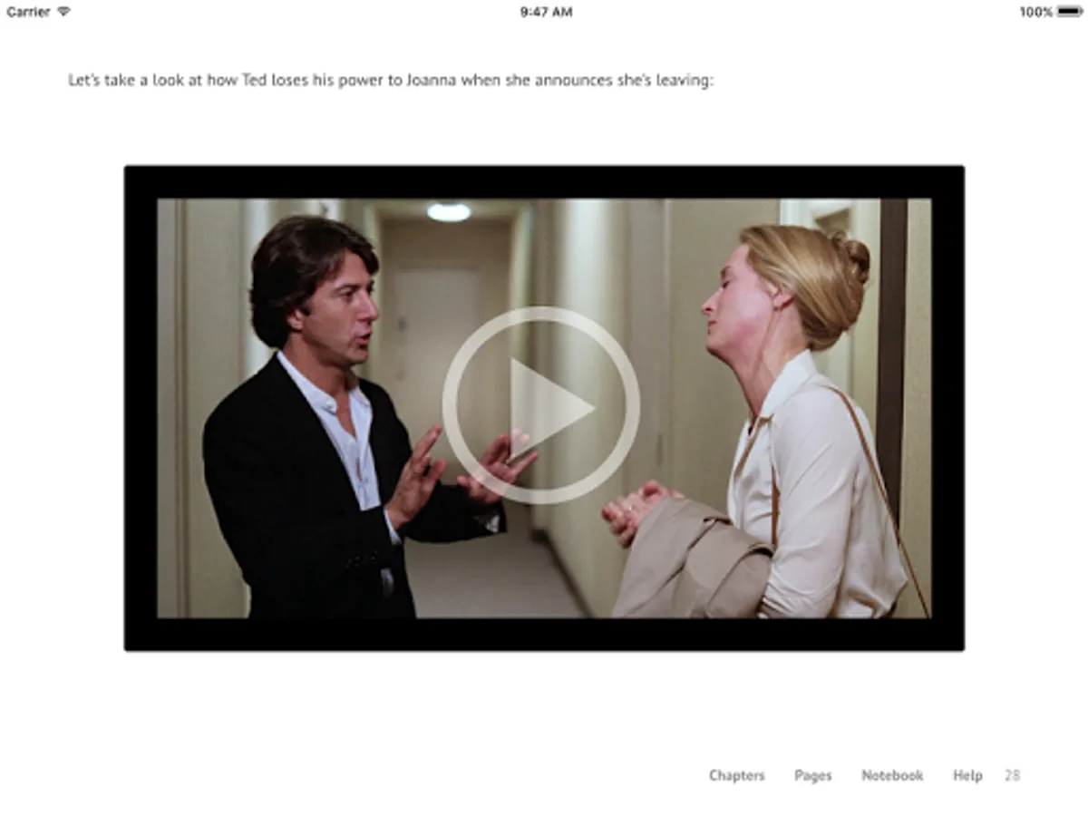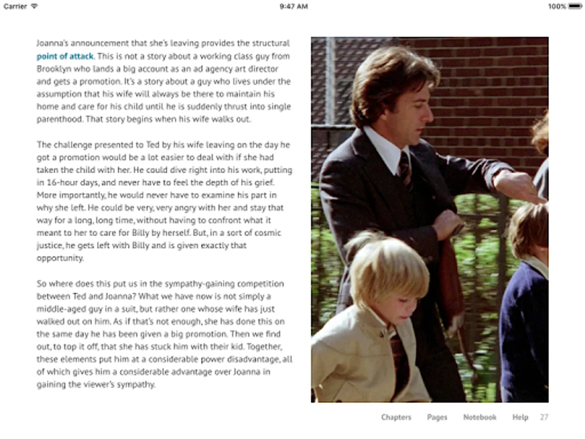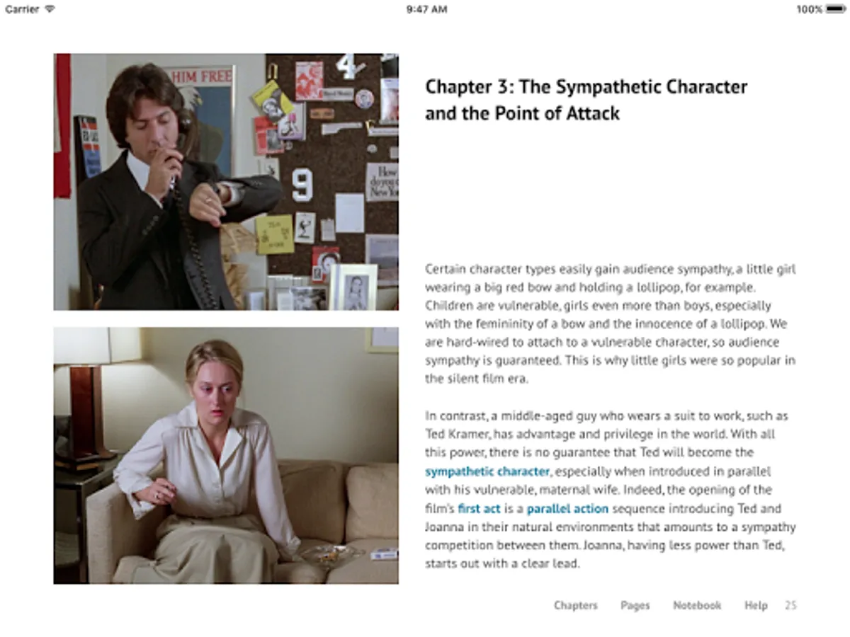 Screentakes screenbooks offer screenplay analysis of time-tested great films in an innovative learning experience that uses text, photos, video, audio and interactive graphics. Unlike the “enhanced ebook,” in which the media elements are supplemental to the text, in our screenbooks the reader engages with the media as an integral part of the narrative flow. They are reading experiences designed for the screen.