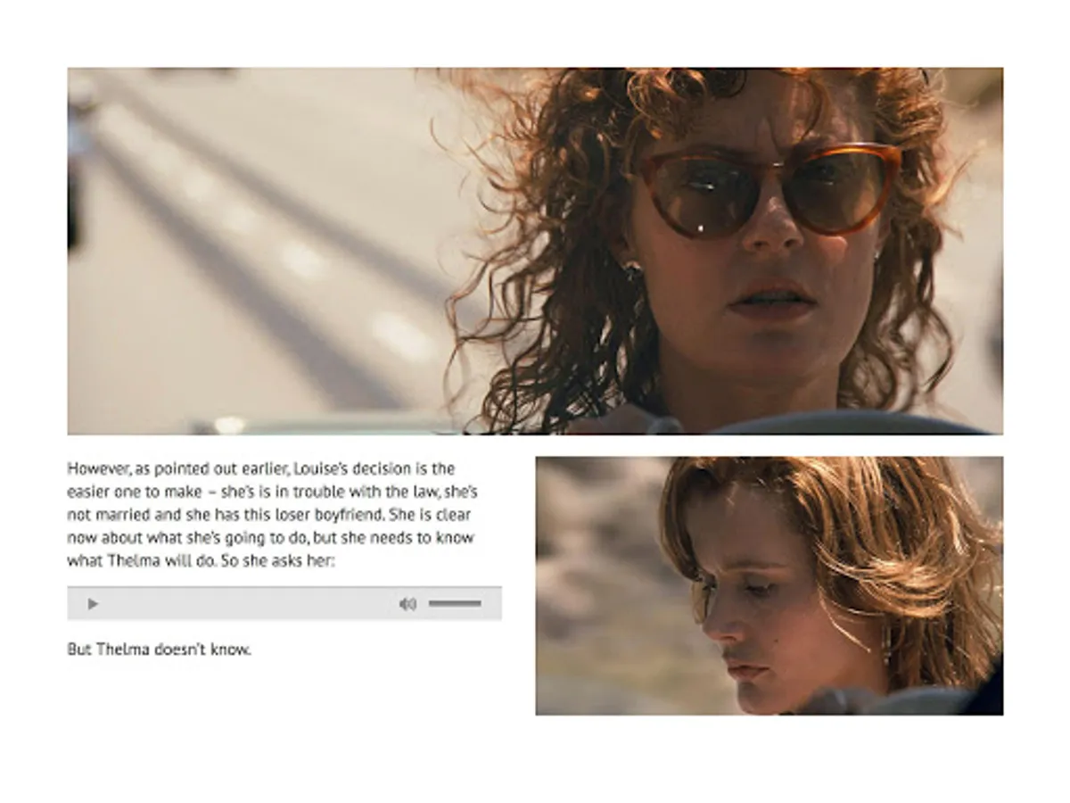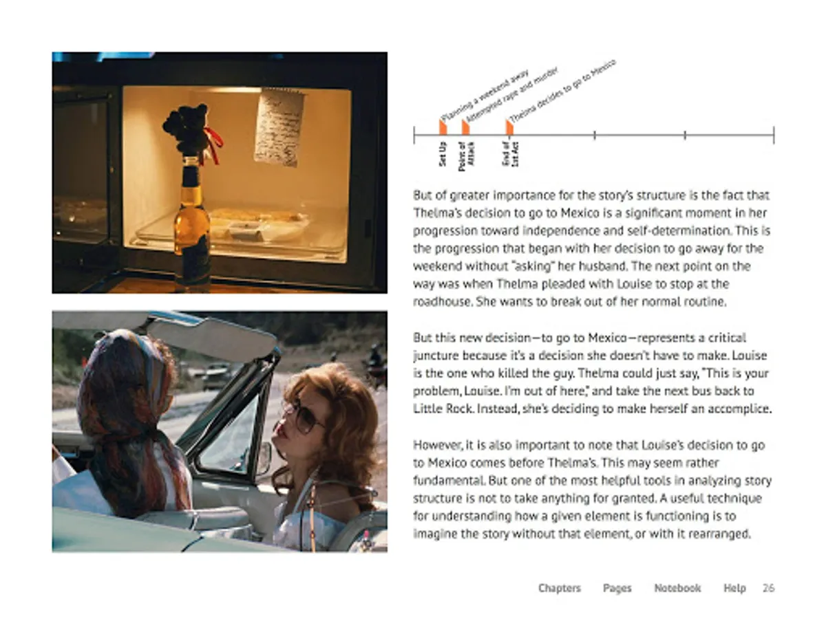 Screentakes screenbooks offer screenplay analysis of time-tested great films in an innovative learning experience that uses text, photos, video, audio and interactive graphics. Unlike the “enhanced ebook,” in which the media elements are supplemental to the text, in our screenbooks the reader engages with the media as an integral part of the narrative flow. They are reading experiences designed for the screen.