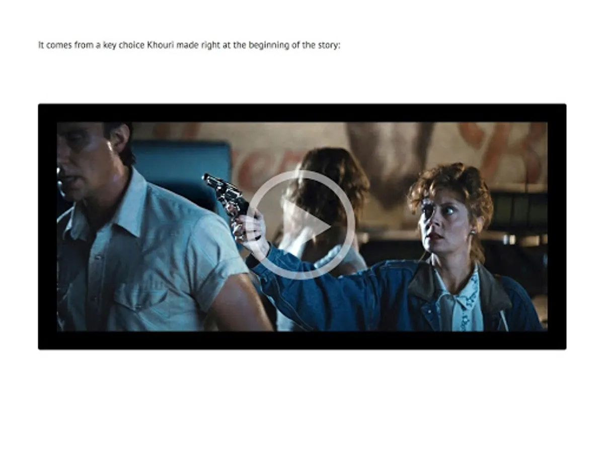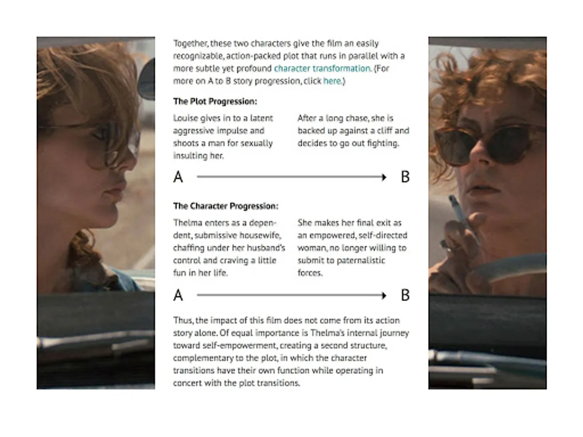 Still relevant decades after its release, Callie Khouri’s metaphor-infused screenplay delivers a radical discourse on gender politics in the guise of an action-packed road film. Thelma & Louise shows how a cinematic story structure can function not only as a high-tension plot narrative, but also as a profound character progression, which, put together, create an overarching social statement. The film’s continuing resonance over time is a direct result of these three levels of its story.