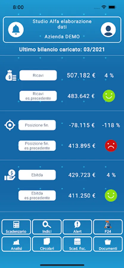 Your company in your hand. This APP is aimed at the firm's client entrepreneurs who manage their company by looking at the numbers. You will have the most important KPIs such as Ebit, Cashflow, Ros updated at any time. In the documents area, in addition to the most requested documents such as financial statements and tax returns, you will receive an in-depth report commented by Dr. Alberto Catanzaro with the guidelines for interpreting the numbers and advice to improve the results of your company. Among the features of the App is the notification of alerts in the event of a sudden worsening of the economic / financial situation. This function is made mandatory by the recent regulation of the business crisis and is fundamental for the responsibilities of the directors. Finally, notification of the most important deadlines for ordinary management is envisaged. For the clients of the firm, the App is completely free.