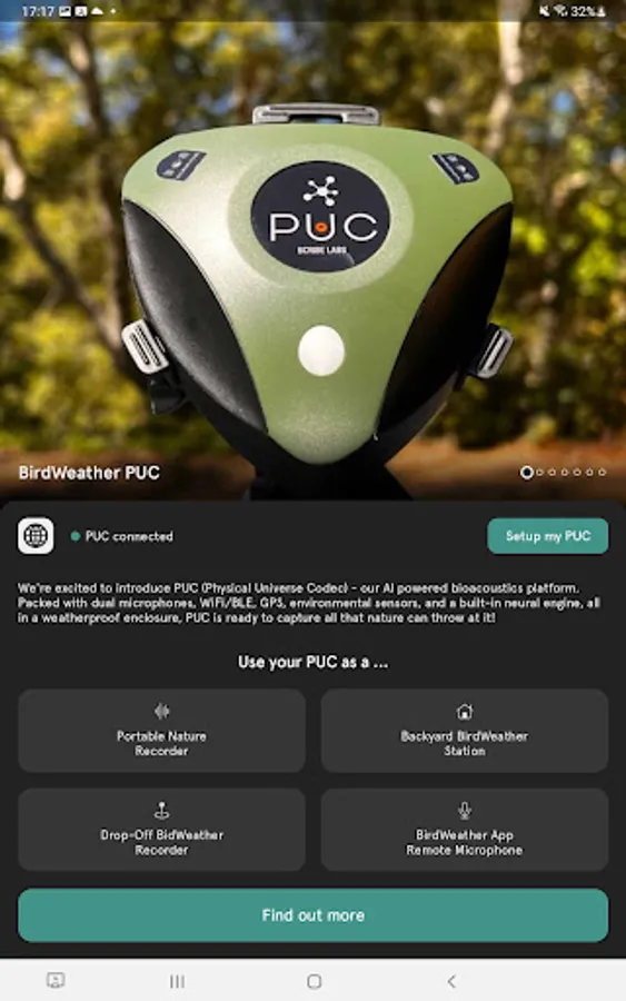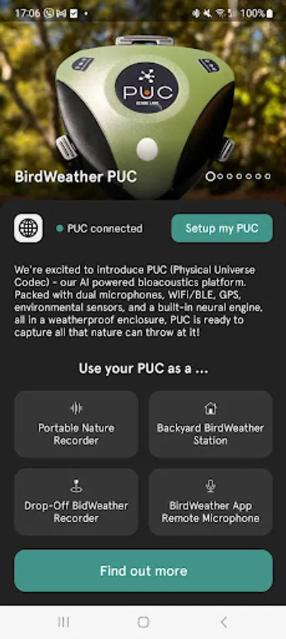Welcome to an all-in-one app for managing your PUC (Physical Universe Codec). PUC is our AI powered bioacoustics platform. Packed with dual microphones, WiFi/BLE, GPS, environmental sensors, and a built-in neural engine, all in a weatherproof enclosure, PUC is ready to capture all that nature can throw at it!
