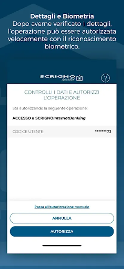 SCRIGNOIdentiTel is able to generate unique and specific OTP codes for the operation in progress, in order to minimize the risk of fraud. For this reason, it is important to preferably use the advanced authentication methods and verify in the detail shown in the app the summary data of the operation you are about to authorize and whose OTP code will be generated and sent to SCRIGNO.