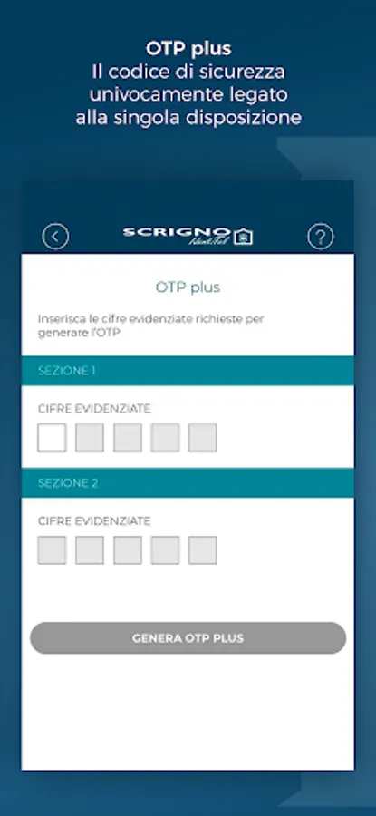 The manual mode for generating the OTP code is also available, which in this case will appear on the smartphone display and must be reported on the SCRIGNO Internet Banking page. In the case of using SCRIGNOapp, this step will take place automatically.