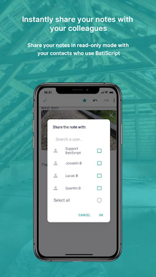 BatiScript offers you a solution to create your notes with photos during your site visits, organize them in your concerned sites, linked to BatiScript.