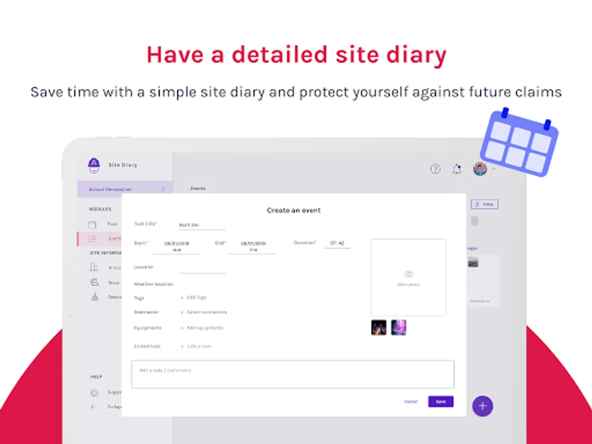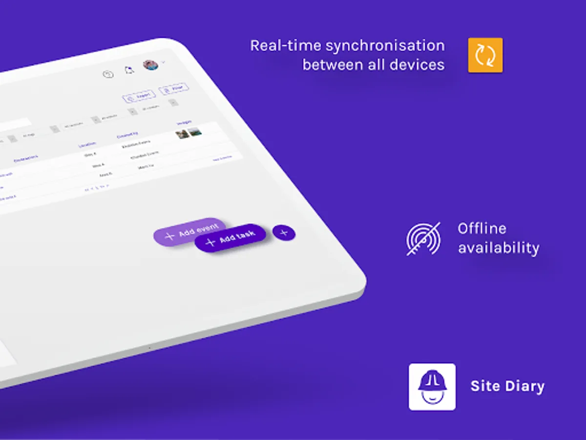 The first product to integrate daily reports and task management. Users can create a task, add information about the task (manpower, equipment & materials to be used) and the persons it assigned to. Report progress on a task by creating a work log. The diary form will be automatically filled with all the task info which will make it a lot quicker for users to fill their daily reports.