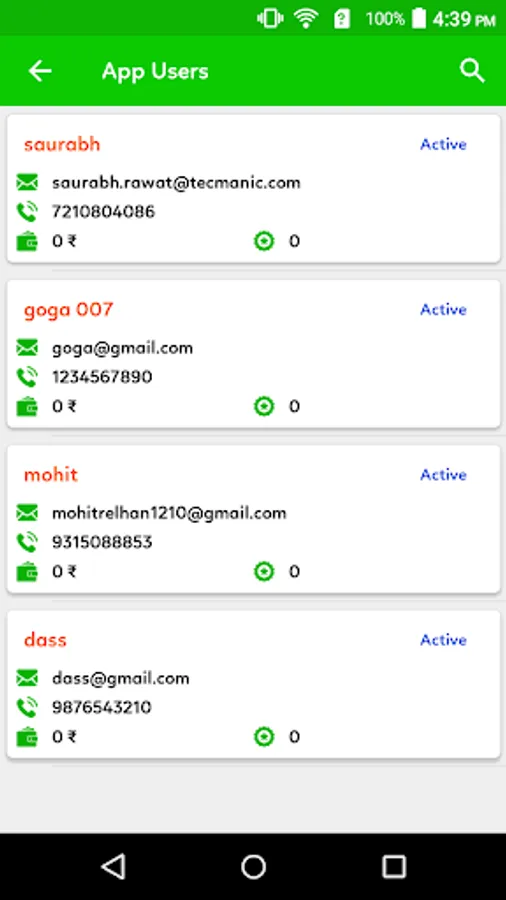 -View all app users (name, mobile, email, wallet balance, reward points)