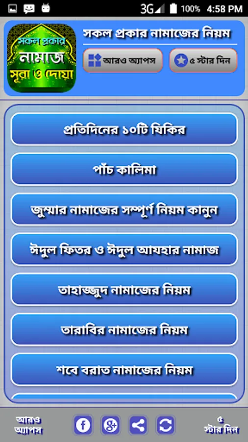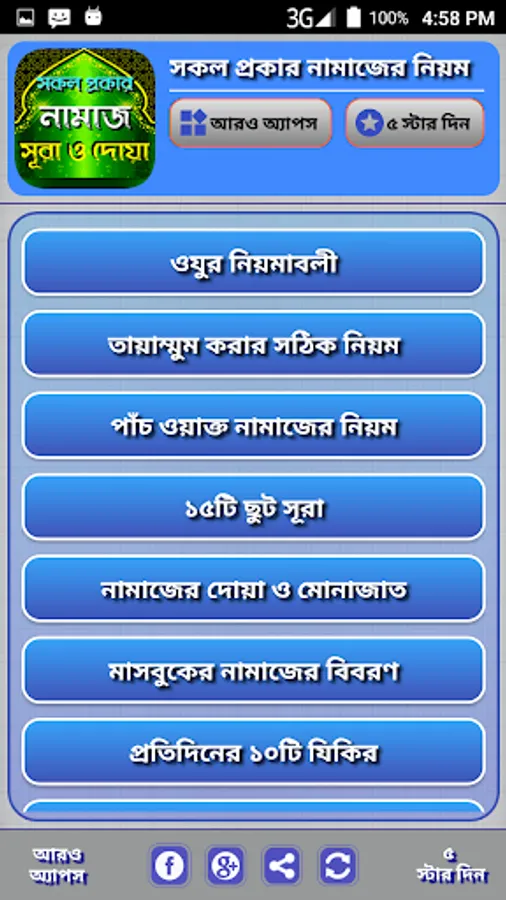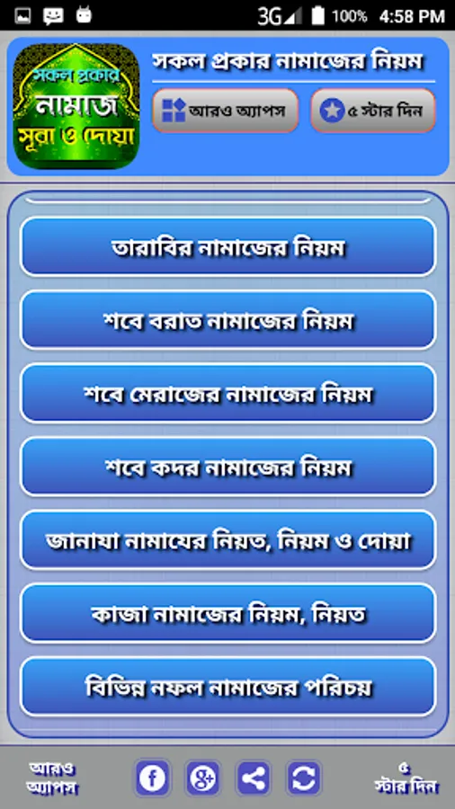 সকল ধরনের নামাজ শিক্ষার অ্যাপলিকেশন নিয়ে আমাদের এই বারের আয়োজন। এই অ্যাপ্লিকেশনের মাধ্যমে আরবি-বাংলা উচ্চারণ ও অর্থসহ পাঁচ কালিমা, পূণাঙ্গ নামাজ শিক্ষা, প্রয়োজনীয় দোয়া-আমল-তদবীর, আরবি-বাংলা উচ্চারণ ও অর্থসহ ১৫ছোট সূরা, বিভিন্ন আয়াতের আমল ও ফযীলত জানতে পারবেন। নামাজ বেহেস্তের চাবিকাঠি, সকল মুসলিমের নামাজ পরা অবশ্যই দায়িত্ব ও পালনীয়। আল্লাহ তার নামাজকে ফরজ হিসাবে কবুল করেছেন তাই সঠিকভাবে নামাজ আদায় করতে হলে অবশ্যই নামাজের নিয়ম জানতে হবে সঠিক পদ্ধিতিতে আদায় করতে হবে। না হলে আমাদের নামাজ কবুল হবে না।আমাদের মধ্যে অনেকেই কিভাবে নামাজ পডতে হবে ও নামাজ আদায়ের সঠিক নিয়ম-পদ্ধতি জানি না।